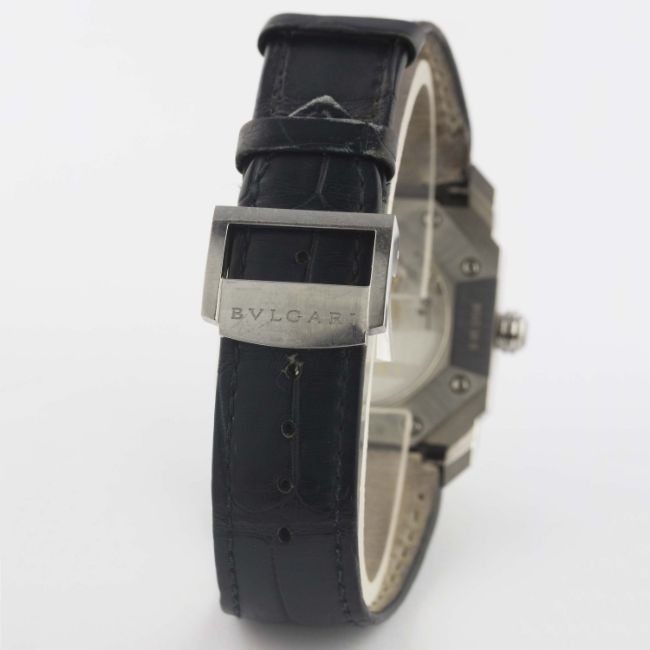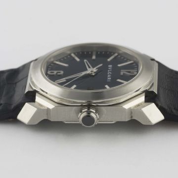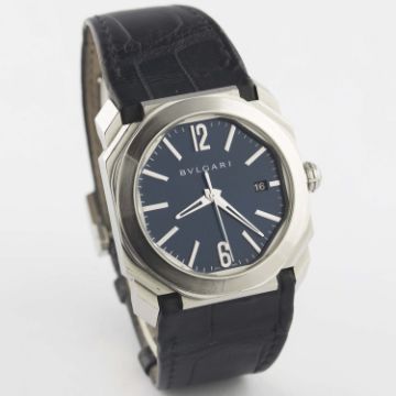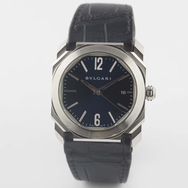 A GENTLEMAN'S STAINLESS STEEL BULGARI OCTO WRIST WATCH CIRCA 2017, REF. BGO 38 S WITH BLUE DIAL Movement: 26J, automatic, cal. BVL 191, signed Bvlgari.Case: Width approx. 39mm, exhibition back, signed Bvlgari Octo, numbered, screw-down crown.Strap: Original Bvlgari leather strap & deployment clasp. CONDITION REPORTDial: Original dial in excellent condition.Movement: Working at present.Case: In excellent condition, with some light scratches due to general use.Strap/Bracelet: In fair condition, deployment clasp in very good condition.