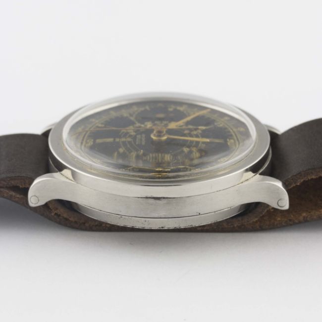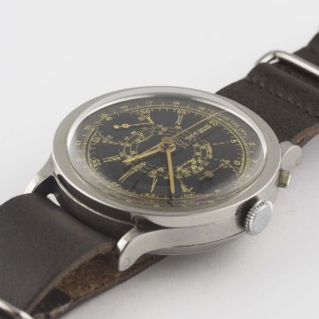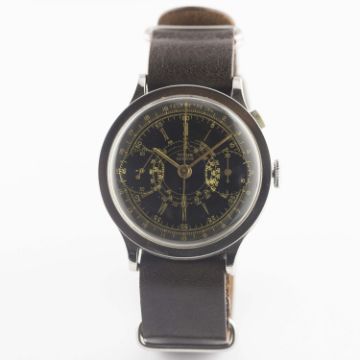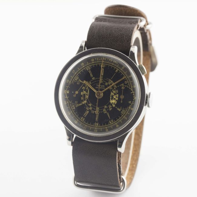 A RARE GENTLEMAN'S LARGE SIZE STAINLESS STEEL TITUS SINGLE BUTTON CHRONOGRAPH WRIST WATCH CIRCA 1940s, WITH GLOSS BLACK & GREY GILT DIALMovement: Manual wind.Case: Diameter approx. 40mm, flat bezel, fixed bars, snap back, numbered, "olive" pusher.Strap: Leather NATO.    CONDITION REPORTDial: Original dial in excellent condition, showing some small signs of age, slight protrusion at 8 o'clock position. Movement: Working at present. Case: In excellent condition, with light scratches due to general use. Strap/Bracelet: In excellent condition.