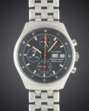 A RARE GENTLEMAN'S STAINLESS STEEL PORSCHE DESIGN ROYAL NAVY AUTOMATIC MILITARY CHRONOGRAPH BRACELET WATCH CIRCA 1980, REF. 777 THOUGHT TO HAVE BEEN PART OF A SMALL BATCH OF WATCHES DELIVERED TO THE ROYAL NAVY FOR EVALUATION, THEY WERE HOWEVER NEVER ISSUED AS THEY WERE FOUND TO BE TOO COSTLY AND EXCEEDED THE ROYAL NAVY'S REQUIREMENTSMovement: 17J, automatic, cal. 5100, numbered.Case: Diameter approx. 41mm, screw back, signed Orfina Watch Ltd, screw-down crown.Bracelet: Unsigned bracelet. CONDITION REPORTDial: Original dial in excellent condition.Movement: Working at present.Case: In excellent condition, with small scratches due to use.Strap/Bracelet: In excellent condition, with some light scratches due to general use.