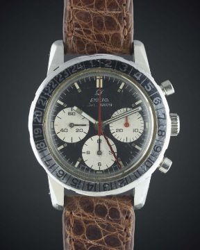 A GENTLEMAN'S STAINLESS STEEL ENICAR JET GRAPH CHRONOGRAPH WRIST WATCH CIRCA 1969Movement: 17J, manual wind, Valjoux cal. 724, signed Enicar.Case: Diameter approx. 41mm, EPSA super compressor, Sherpa 300 emblem embossed on case back, signed Enicar Watch Co, dated 8-69, numbered, 24 hour rotating bezel (missing red pointer), Enicar crown.Strap: Leather. CONDITION REPORTDial: Original dial in very good condition.Movement: Working at present.Case: In fair condition, with scratches and wear due to general use.Strap/Bracelet: In good condition.