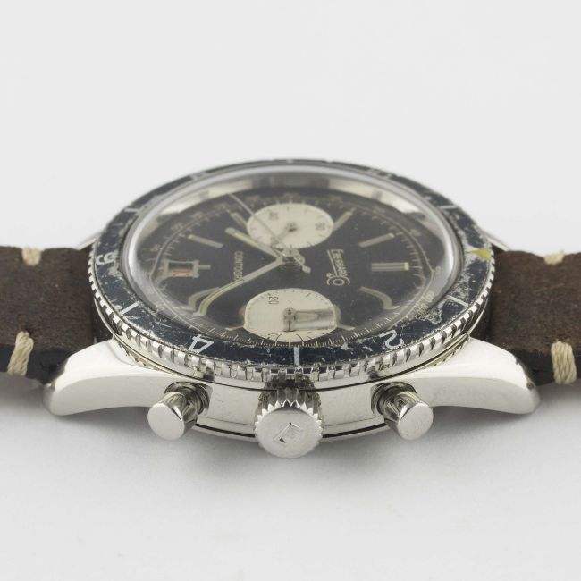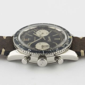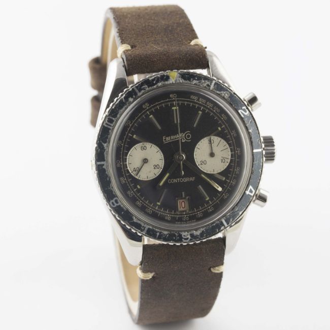 A RARE GENTLEMAN'S STAINLESS STEEL EBERHARD & CO CONTOGRAF CHRONOGRAPH WRIST WATCH CIRCA 1965, REF. 131501 WITH QUICK-SET "ROULETTE" DATE Movement: 21J, manual wind, cal. 310-82, signed Eberhard & Co. Case: Diameter approx. 39mm, screw back, emblem embossed on case back, signed Eberhard & Co, maker's mark HF, numbered, quick-set date pusher, 12 hour rotating bezel, Eberhard crown.Strap: Leather.     CONDITION REPORTDial: Original dial in good condition, with some marks to the surface near centre. Movement: Working at present. Case: In good condition, showing scratches & wear to bezel. Strap/Bracelet: In excellent condition.