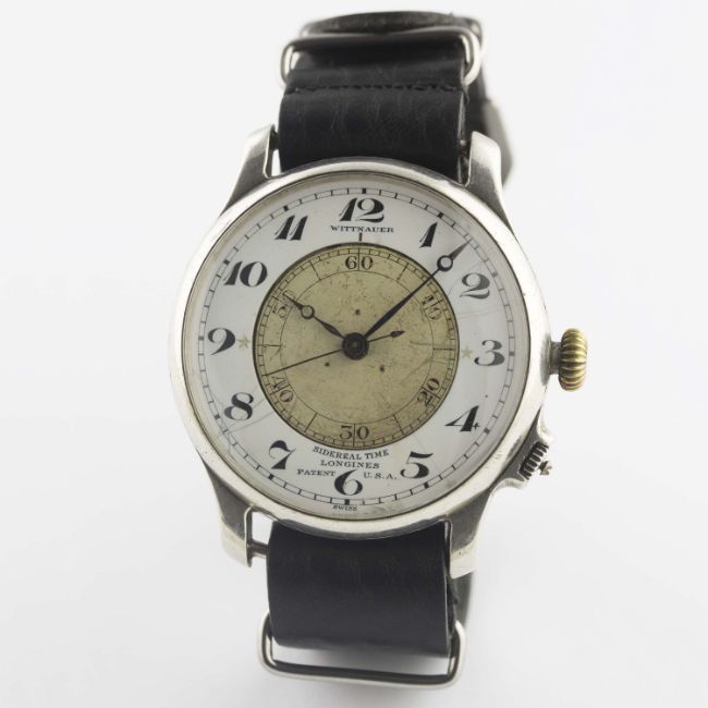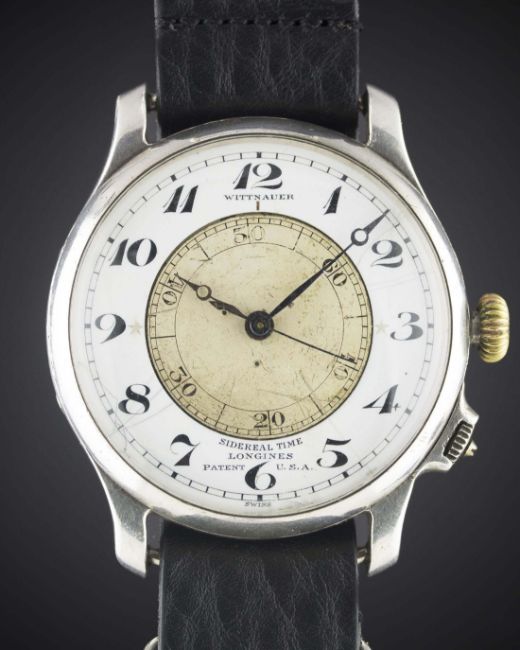 A RARE GENTLEMAN'S SOLID SILVER LONGINES WITTNAUER SIDEREAL TIME NAVIGATORS WRIST WATCH CIRCA 1930s, REF. 38330 P.V.H.WEEMSMovement: 15J, manual wind, signed Longines Watch Co, numbered, US import mark LXW. Case: Diameter approx. 47mm, fixed bars, hinged case, inner cuvette with matching markings, signed Longines, numbered, hallmarked, secondary crown used to rotate inner dial.Strap: Leather NATO. CONDITION REPORTDial: Original dial in good condition, showing signs of age, enamel showing some hairline cracks & chips.Movement: Working at present.Case: In good condition, with scratches & some general wear due to use.Strap/Bracelet: In excellent condition.