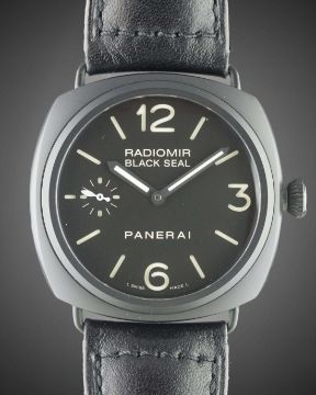 A GENTLEMAN'S BLACK CERAMIC PANERAI RADIOMIR BLACK SEAL WRIST WATCH CIRCA 2012, REF. PAM00292 O SERIES LIMITED TO 2000 PIECES, ACCOMPANIED BY ADDITIONAL BROWN LEATHER PANERAI STRAPMovement: Manual wind, signed Officine Panerai.Case: Diameter approx. 45mm, signed Officine Panerai Black Seal Ceramic, case ref. OP 6723, numbered, original screw-down crown. Strap: Panerai leather strap & pin buckle. CONDITION REPORTDial: Original dial in excellent condition.Movement: Working at present.Case: In excellent condition.Strap/Bracelet: Both in excellent condition.