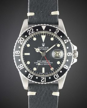 A RARE GENTLEMAN'S STAINLESS STEEL ROLEX OYSTER PERPETUAL GMT MASTER WRIST WATCHCIRCA 1967, REF. 1675 WITH MK1 "LONG E" MATT DIAL & SMALL ARROW HANDMovement: 26J, automatic chronometer, cal. 1570, signed Montres Rolex S.A., numbered.Case: Diameter approx. 40mm, Oyster case, signed Montres Rolex S.A., dated II.67, numbered, 24 hour rotating "all black" bezel, Rolex crown.Strap: Leather. CONDITION REPORTDial: Original dial in excellent condition.Movement: Working at present.Case: In good condition, with some small scratches & wear due to general use.Strap/Bracelet: In excellent condition.