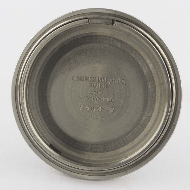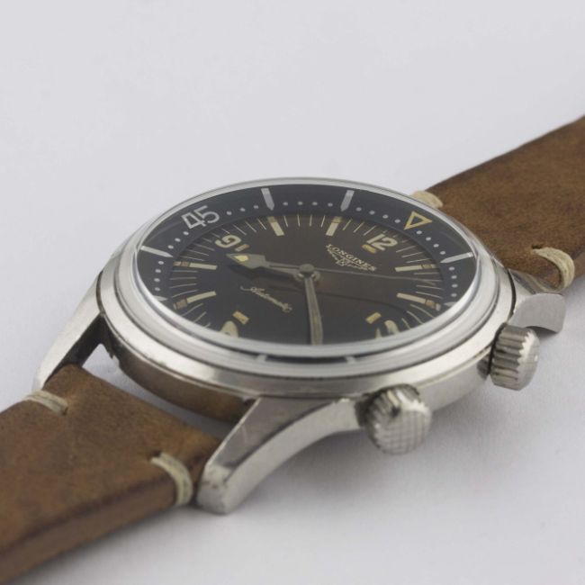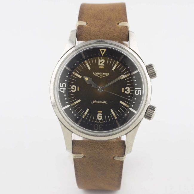 A RARE GENTLEMAN'S STAINLESS STEEL LONGINES AUTOMATIC DIVERS WRIST WATCH CIRCA 1966, REF. 7494-2 WITH GLOSS BLACK DIAL TURNED BROWNMovement: 24J, automatic, cal. 290, signed Longines, numbered. Case: Diameter approx. 42mm, screw back, spear-diver emblem embossed on case back, signed Longines Watch Co, numbered, name inscription to case back, anti-slip crowns.Strap: Leather. CONDITION REPORTDial: Original dial in excellent condition, dial turned to a brown colour showing some small signs of age.Movement: Working at present.Case: In very good condition, with small scratches due to general use.Strap/Bracelet: In excellent condition.
