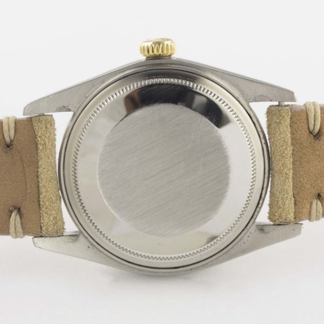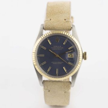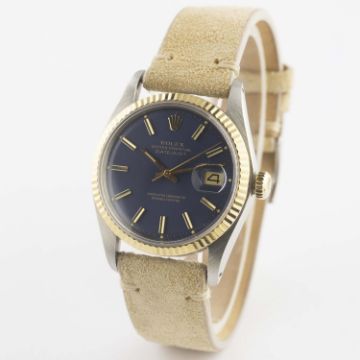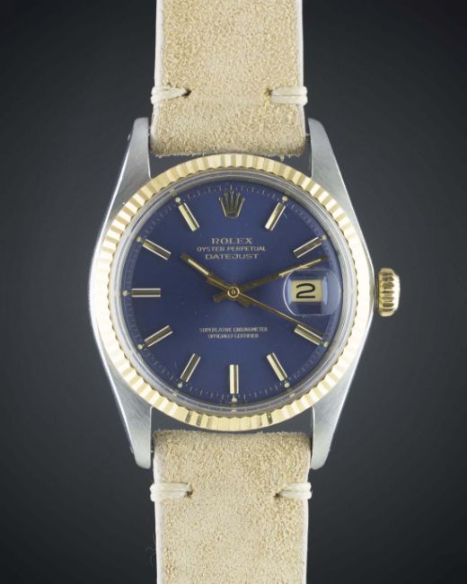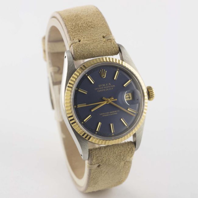 A GENTLEMAN'S STEEL & GOLD ROLEX OYSTER PERPETUAL DATEJUST WRIST WATCHCIRCA 1975, REF. 1601 WITH BLUE DIALMovement: 26J, automatic chronometer, cal. 1570, signed Montres Rolex S.A., numbered.Case: Diameter approx. 36mm, Oyster case, signed Montres Rolex S.A., numbered, solid gold fluted bezel, Rolex crown.Strap: Suede. CONDITION REPORTDial: Original dial in excellent condition, some very small signs of age.Movement: Working at present.Case: In very good condition, with some signs of wear due to general use.Strap/Bracelet: In excellent condition.