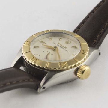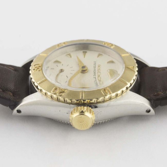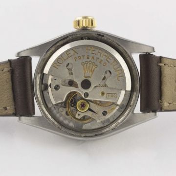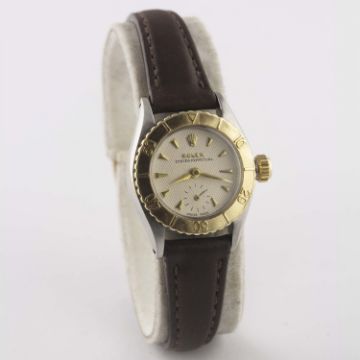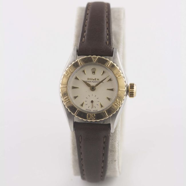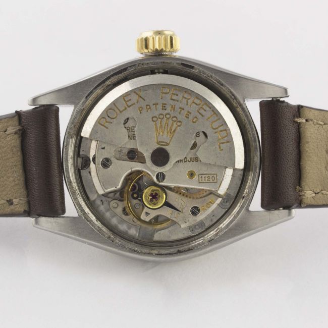 A LADIES STEEL & GOLD ROLEX OYSTER PERPETUAL "TURNOGRAPH" WRIST WATCHCIRCA 1963, REF. 6506 Movement: 15J, automatic with "butterfly" rotor, cal. 1120, signed Rolex Perpetual, numbered.Case: Diameter approx. 25mm, Oyster case, signed Montres Rolex S.A, numbered, solid gold 60 minute rotating "thunderbird" bezel, Rolex crown.Strap: Leather with gold plated Rolex pin buckle. CONDITION REPORTDial: Refinished "honeycomb" dial in excellent condition.Movement: Working at present.Case: In excellent condition, with some light scratches due to general use.Strap/Bracelet: In excellent condition.