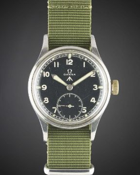 A GENTLEMAN'S STAINLESS STEEL BRITISH MILITARY OMEGA W.W.W. WRIST WATCH CIRCA 1940s, PART OF THE "DIRTY DOZEN" Movement: 15J, manual wind, cal. 30T2, signed Omega, numbered.Case: Diameter approx. 35mm, fixed bars, screw back, signed Omega Watch Co, issue markings W.W.W. ^ Y5339 10669538.Strap: NATO. CONDITION REPORTDial: Original dial in very good condition, showing small signs of age.Movement: Working at present.Case: In good condition, with small scratches & wear due to use.Strap/Bracelet: In excellent condition.