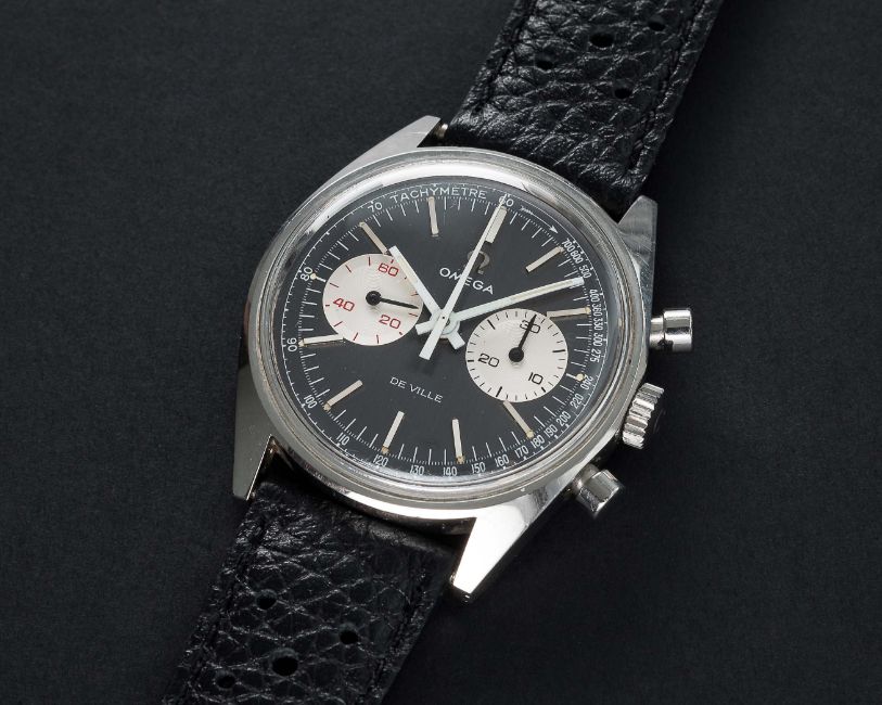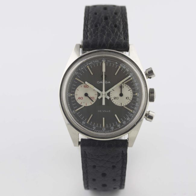 A RARE GENTLEMAN'S STAINLESS STEEL OMEGA DE VILLE CHRONOGRAPH WRIST WATCH CIRCA 1974, REF. 145.017 WITH BRUSHED GREY REVERSE "PANDA" DIALMovement: 17J, manual wind, cal. 860, signed Omega, numbered. Case: Diameter approx. 35mm, screw back, signed Omega Watch Co, Omega crown.Strap: Perforated leather. CONDITION REPORTDial: Original dial in excellent condition.Movement: Working at present.Case: In excellent condition, with light scratches due to general use.Strap/Bracelet: In excellent condition.