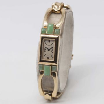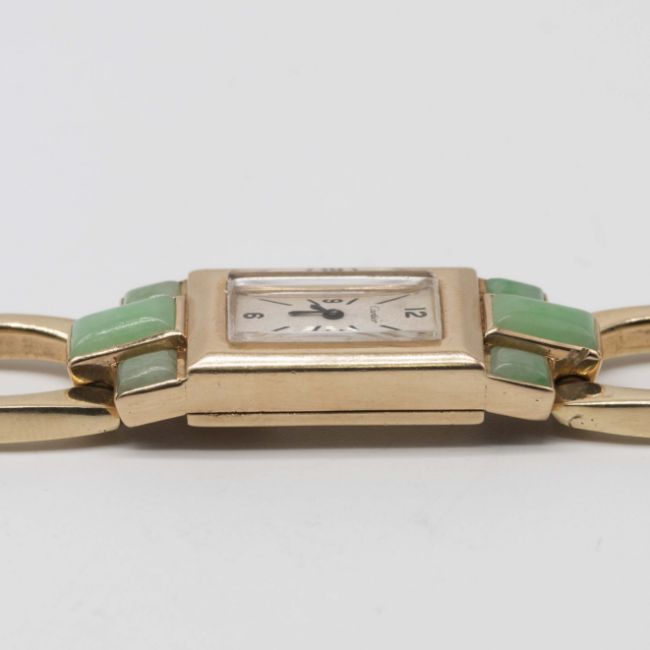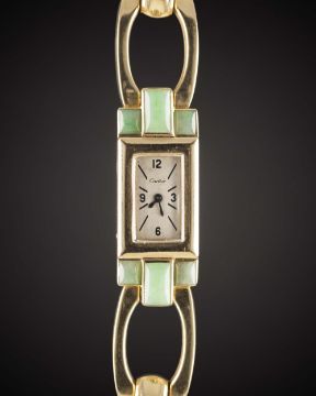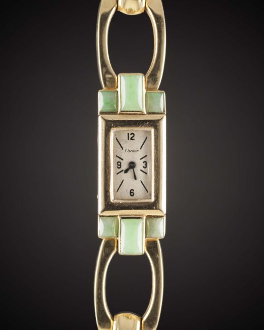 A RARE LADIES 14K SOLID GOLD & JADE CARTIER BRACELET WATCHCIRCA 1940, MADE FOR THE AMERICAN MARKET Movement: 16J, manual back wind, cal. 403, signed LeCoultre Co., LXJ import code.Case: Approx. 40mm (inc. lugs) by 15mm, marked 14k, Cartier number 2670 on back of lug, dust-cap. Bracelet: 14k solid gold bracelet, marked Italy 14Kt with maker's mark, total length approx. 186mm. CONDITION REPORTDial: Original dial in good condition, showing some small signs of age.Movement: Working at present.Case: In excellent condition, with light scratches due to general use.Strap/Bracelet: In excellent condition.
