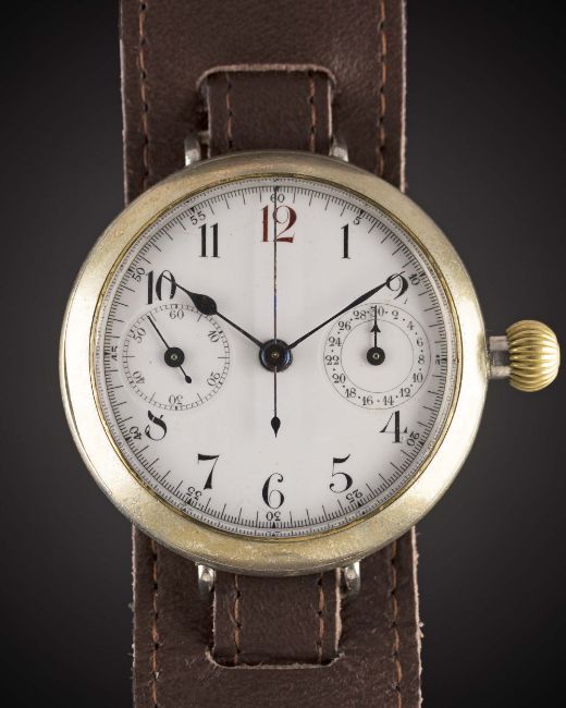 A GENTLEMAN'S LARGE SIZE NICKEL CASED SINGLE BUTTON PILOTS CHRONOGRAPH WRIST WATCHCIRCA 1920s, WITH WHITE ENAMEL DIAL & BLUE STEEL HANDSMovement: Manual wind.Case: Diameter approx. 43mm, snap back, "onion" crown. Strap: Leather. CONDITION REPORTDial: Original dial in very good condition, two very faint hairline cracks at 6 o'clock & 11 o'clock positions.Movement: Working at present.Case: In very good condition, with light scratches due to use.Strap/Bracelet: In excellent condition.
