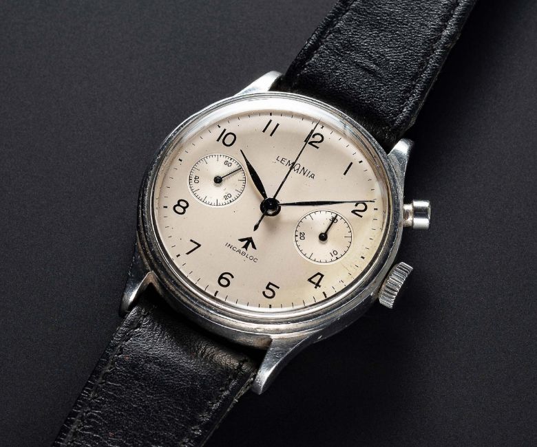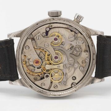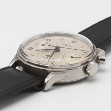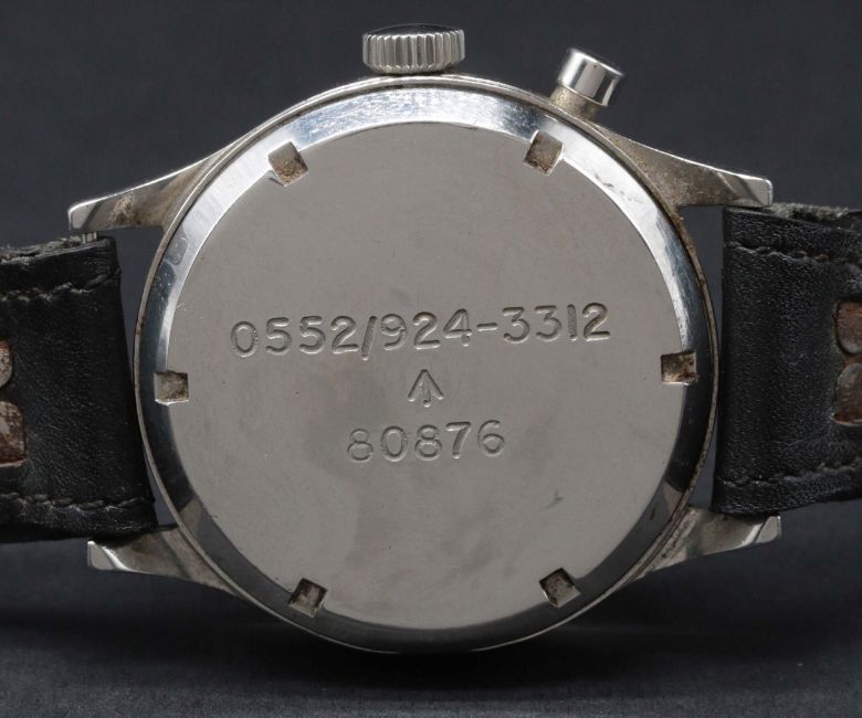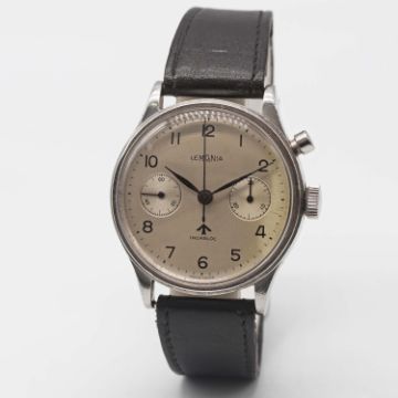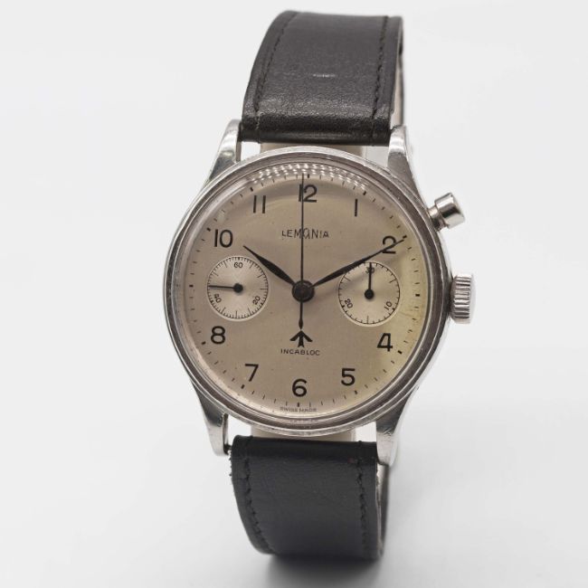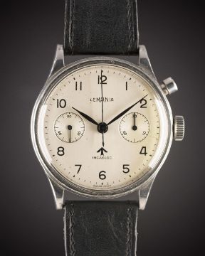 A VERY RARE GENTLEMAN'S STAINLESS STEEL BRITISH MILITARY ROYAL NAVY NUCLEAR SUBMARINE LEMANIA SINGLE BUTTON CHRONOGRAPH WRIST WATCH CIRCA 1950s Movement: 17J, manual wind, cal. 2220, signed Lemania Watch Co, numbered.Case: Diameter approx. 39mm, fixed bars, screw back, maker's mark HF, issue markings 0552/924-3312 ^ 80876. Strap: Leather. These watches were issued to personnel onboard nuclear submarines. The dials & hands did not contain any luminous material which therefore could not interfere with radiation detectors onboard (giving false positive readings). CONDITION REPORTDial: Original dial in good condition, showing some signs of age.Movement: Working at present.Case: In very good condition, with some small scratches due to use.Strap/Bracelet: In fair condition.
