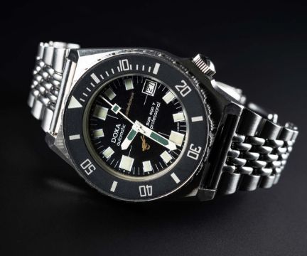 A RARE GENTLEMAN'S STAINLESS STEEL DOXA SPIROTECHNIQUE SUB 600T PROFESSIONAL AUTOMATIC DIVERS BRACELET WATCH CIRCA 1970s, REF. 4653Movement: 17J, automatic, cal. 2872, signed Doxa.Case: Width approx. 39mm, screw back, numbered, 60 minute rotating bezel, screw-down crown.Bracelet: Original Doxa stainless steel Expandro bracelet. CONDITION REPORTDial: Original dial in excellent condition.Movement: Working at present.Case: In excellent condition, with some small scratches due to general use.Strap/Bracelet: In excellent condition, with some light scratches due to general use.