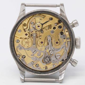 A VERY RARE GENTLEMAN'S LARGE SIZE STAINLESS STEEL GERMAN MILITARY AIR FORCE LEMANIA 15TL PILOTS CHRONOGRAPH WRIST WATCH CIRCA 1940, WITH GLOSS BLACK DIAL & STEPPED "WATERPROOF" CASE Movement: Manual wind, cal. 15TL, signed Lemania, numbered. Case: Diameter approx. 38mm, screw back, numbered, issue markings RLM-Nav. 5067, "pump" pushers.Strap: Leather NATO. CONDITION REPORTDial: Original dial in very good condition, showing some signs of age.Movement: Working at present.Case: In excellent condition, with some small scratches due to use.Strap/Bracelet: In excellent condition.