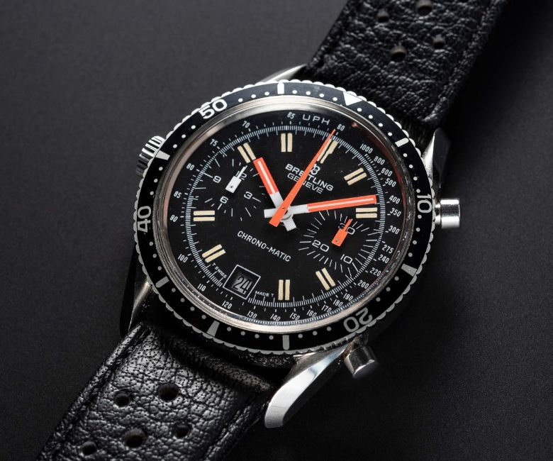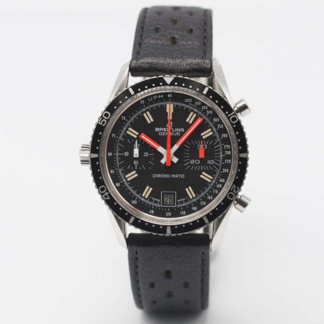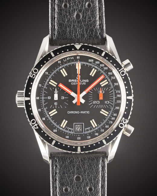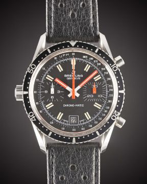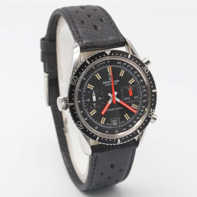 A RARE GENTLEMAN'S STAINLESS STEEL BREITLING CHRONO-MATIC CHRONOGRAPH WRIST WATCH CIRCA 1977, REF. 2130 WITH "LYRE" LUGS & "ALL BLACK" DIAL  Movement: 17J, automatic, cal. 11, signed Breitling.Case: Diameter approx. 38mm, screw back, signed Breitling, numbered 1,4xx,xxx, 60 minute rotating bezel, Breitling crown. Strap: Perforated leather. CONDITION REPORTDial: Original dial in excellent condition.Movement: Working at present.Case: In excellent condition, with some light scratches due to occasional use.Strap/Bracelet: In excellent condition.