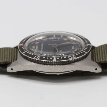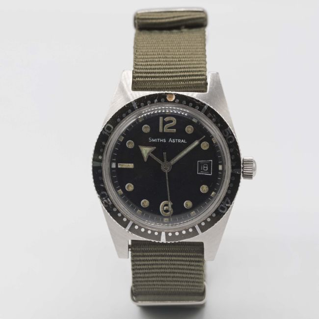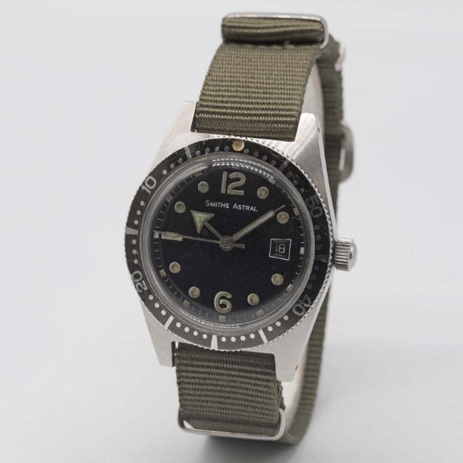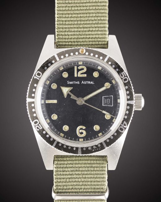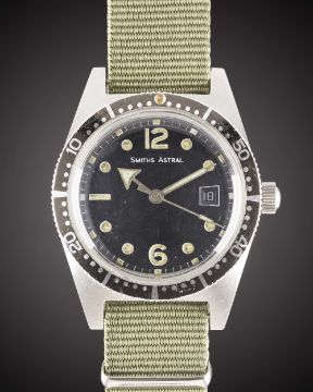 A GENTLEMAN'S STAINLESS STEEL SMITHS ASTRAL "SKIN DIVER" WRIST WATCH CIRCA 1969, REF. CM4501 WITH GLOSS BLACK DIAL & "ARROW" HANDS Movement: 17J, manual wind, hacking seconds, cal. 60465E, signed Made in England, numbered.Case: Diameter approx. 38mm, screw back, signed 20 Atmospheres, 60 minute rotating bezel, original crown.Strap: NATO. CONDITION REPORTDial: Original dial in good condition, showing some signs of age.Movement: Working at present.Case: In very good condition, with some small scratches due to general use.Strap/Bracelet: In excellent condition.