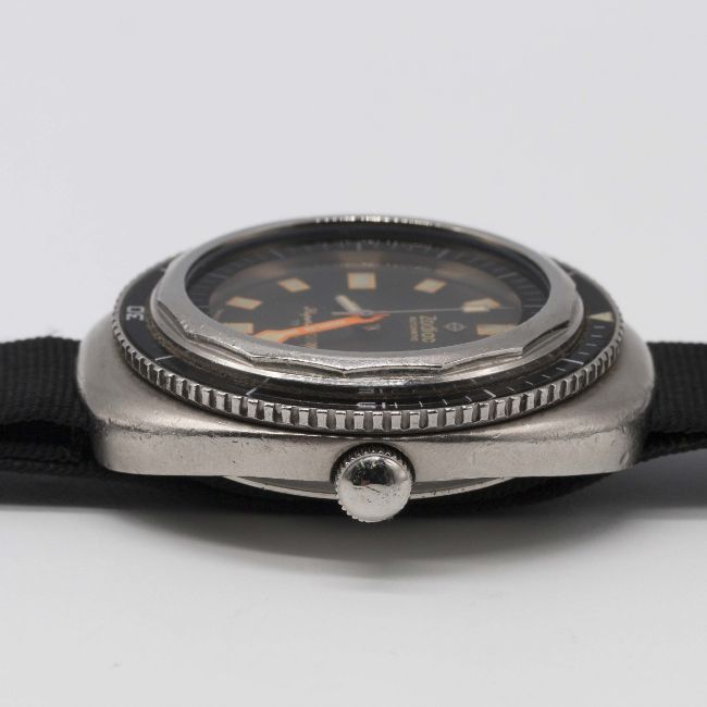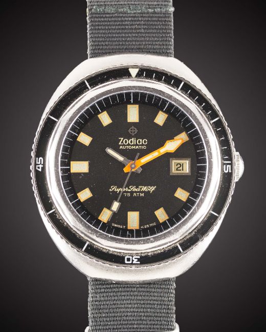 A GENTLEMAN'S STAINLESS STEEL ZODIAC SUPER SEA WOLF AUTOMATIC DIVERS WRIST WATCH CIRCA 1970, REF. 722 936 WITH "SERPENT" HANDSMovement: 21J, automatic, cal. 72B, signed Zodiac Ltd. Case: Diameter approx. 43mm, screw back, signed Zodiac Ltd, numbered, 60 minute rotating acrylic bezel, screw-down crown.Strap: NATO. CONDITION REPORTDial: Original dial in excellent condition, showing small signs of age.Movement: Working at present.Case: In very good condition, with small scratches due to general use.Strap/Bracelet: In very good condition.