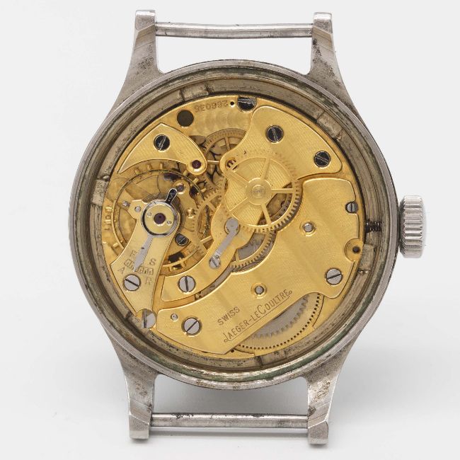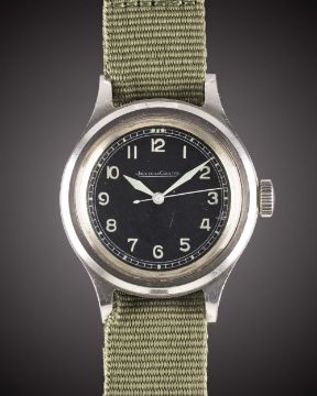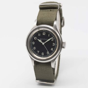 A RARE GENTLEMAN'S STAINLESS STEEL BRITISH MILITARY JAEGER LECOULTRE RAF PILOTS WRIST WATCH DATED 1956, WITH BLACK DIALMovement: Manual wind, cal. 470/1, signed Jaeger-LeCoultre, numbered.Case: Diameter approx. 36mm, fixed bars, screw back, issue markings A.M. 6B/159 3211/56, dust cover.Strap: NATO. CONDITION REPORTDial: MOD dial in excellent condition.Movement: Working at present.Case: In excellent condition, with small scratches due to use.Strap/Bracelet: In excellent condition.