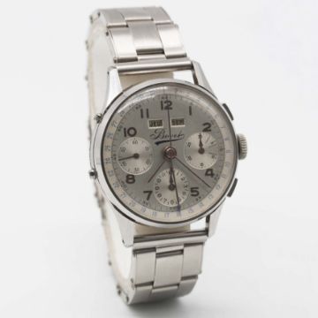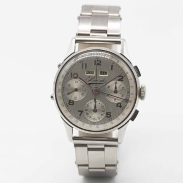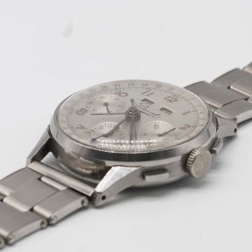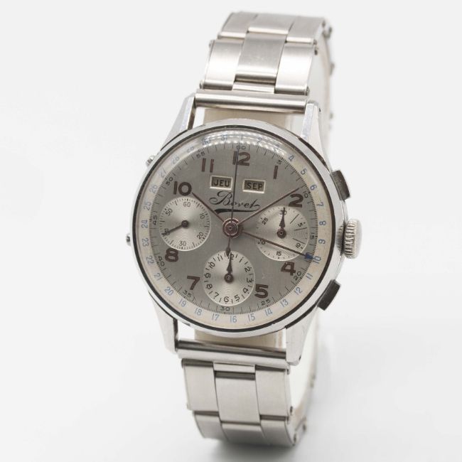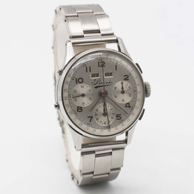 A RARE GENTLEMAN'S STAINLESS STEEL BOVET TRIPLE CALENDAR CHRONOGRAPH BRACELET WATCH CIRCA 1940s, TWO TONE SILVER DIAL WITH ROSE GOLD ARABIC NUMERALS & HANDSMovement: 17J, manual wind, Valjoux cal. 72C, signed Bovet Freres & Co. SA.Case: Diameter approx. 35mm, snap back, signed Bovet Freres & Co. SA, numbered.Bracelet: Riveted "Oyster" bracelet. CONDITION REPORTDial: Original dial in excellent condition, showing small signs of age.Movement: Working at present.Case: In excellent condition, with some small scratches due to general use.Strap/Bracelet: In excellent condition, with some light scratches due to general use.