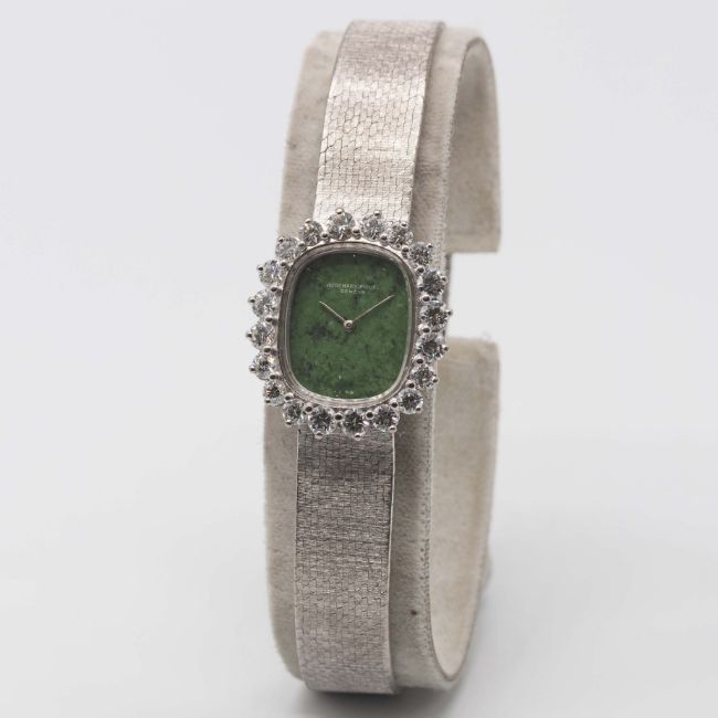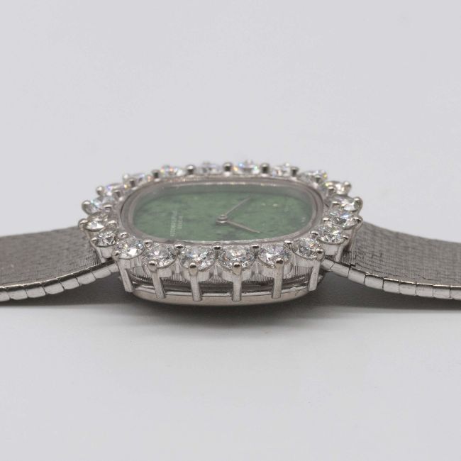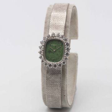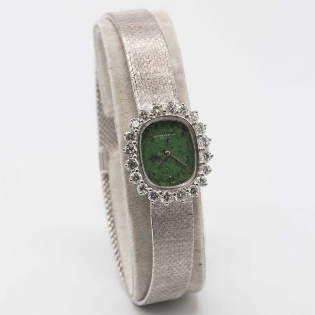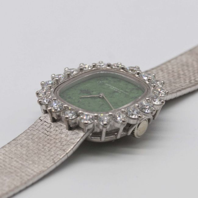 A FINE LADIES 18K SOLID WHITE GOLD & DIAMOND AUDEMARS PIGUET BRACELET WATCHCIRCA 1970s, WITH GREEN MALACHITE DIALMovement: 20J, manual wind, signed Audemars Piguet, numbered.Case: Approx. 24mm by 22mm, original diamond set surround, signed Audemars Piguet & Co, numbered, 18k hallmarks. Bracelet: Original 18k solid white gold AP bracelet, total length approx. 180mm. CONDITION REPORTDial: Original dial in very good condition.Movement: Working at present.Case: In very good condition, with some light scratches due to general use.Strap/Bracelet: In very good condition.