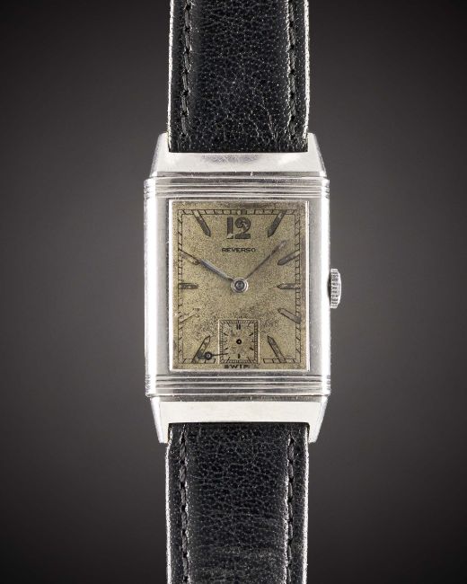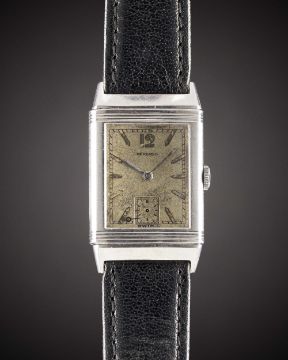 A GENTLEMAN'S STAINLESS STEEL JAEGER LECOULTRE REVERSO WRIST WATCHCIRCA 1930sMovement: 17J, manual wind, cal. C 438/4 W signed LeCoultre Co, numbered.Case: Approx. 39mm by 23mm, clean reverse side, signed LeCoultre, marked Brevete S.D.G.D., numbered, inscription to case back 'R.A. Morris 129'.Strap: Leather.CONDITION REPORTDial: Original dial in fair condition, showing signs of age.Movement: Working at present.Case: In very good condition, with some light scratches due to general use.Strap/Bracelet: In excellent condition.
