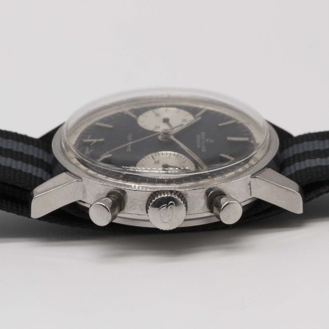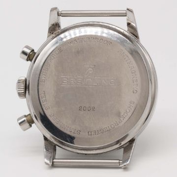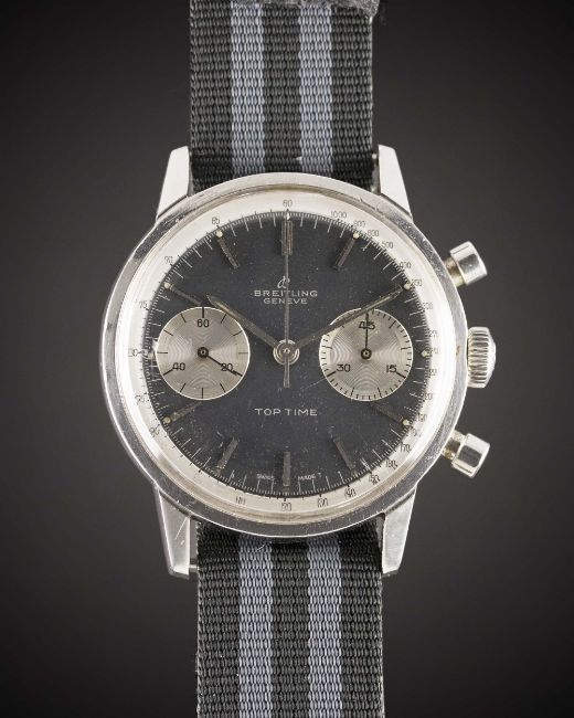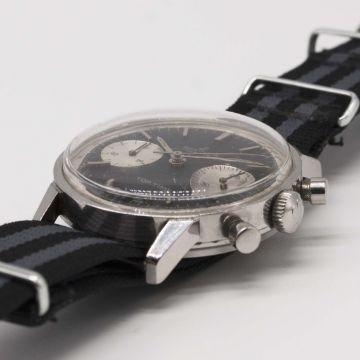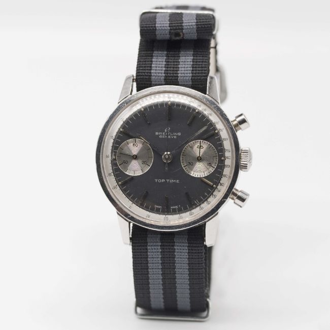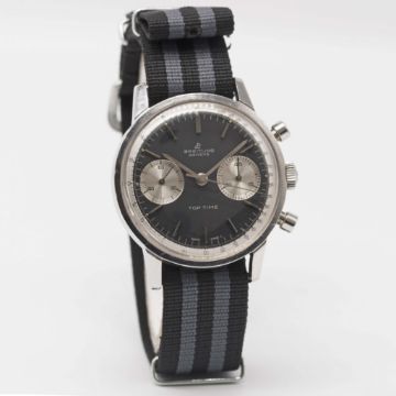 A GENTLEMAN'S STAINLESS STEEL BREITLING TOP TIME "THUNDERBALL" CHRONOGRAPH WRIST WATCHCIRCA 1960s, REF. 2002 WITH "REVERSE PANDA" DIAL, THE MODEL MODIFIED FOR USE AS A GEIGER COUNTER WORN BY SEAN CONNERY IN THE 1965 JAMES BOND FILM "THUNDERBALL"  Movement: 17J, manual wind, signed Breitling Watch Ltd. Case: Diameter approx. 36mm, "monocoque" case, signed Breitling, Breitling crown.Strap: "James Bond" NATO.CONDITION REPORTDial: Original dial in excellent condition, showing some very small signs of age.Movement: Working at present.Case: In excellent condition, with light scratches due to general use.Strap/Bracelet: In excellent condition.