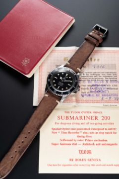 A RARE GENTLEMAN'S STAINLESS STEEL ROLEX TUDOR OYSTER PRINCE SUBMARINER WRIST WATCHCIRCA 1968, REF. 7016/0 WITH ORIGINAL GUARANTEE (SOLD IN 1973, FILLED IN WITH REFERENCE), WALLET & "SUBMARINER 200" CARDMovement: Automatic, ETA base calibre, signed Tudor Auto-Prince.Case: Diameter approx. 40mm, Oyster case, signed Montres Tudor S.A., numbered 62x,xxx, dated I.68, "fat font" 60 minute rotating bezel, Rolex crown.Strap: Leather.CONDITION REPORTDial: Original dial in excellent condition.Movement: Working at present.Case: In excellent condition, with some small scratches due to general use.Strap/Bracelet: In excellent condition.