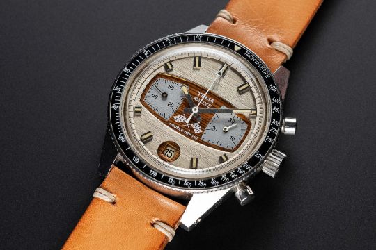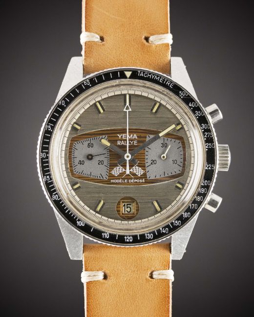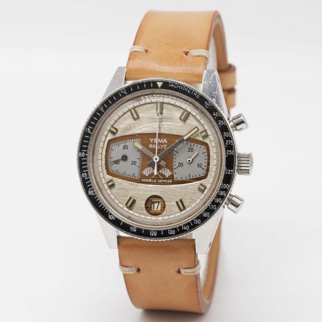 A RARE GENTLEMAN'S STAINLESS STEEL YEMA RALLYE "FORMICA" CHRONOGRAPH WRIST WATCH CIRCA 1970, WITH WOOD EFFECT DIAL INSPIRED BY THE DASHBOARD OF CARS FROM THE PERIODMovement: 17J, manual wind, Valjoux cal. 7734.Case: Diameter approx. 39mm, screw back, numbered, tachymetre bakelite bezel. Strap: Leather.    CONDITION REPORTDial: Original dial in excellent condition, showing some small signs of age. Movement: Working at present. Case: In very good condition, with light scratches due to general use. Strap/Bracelet: In excellent condition.