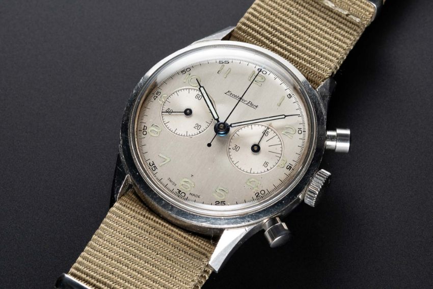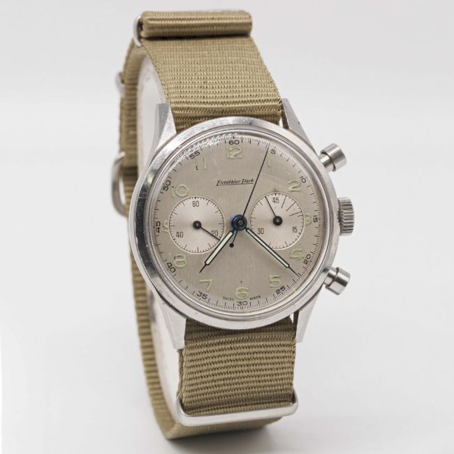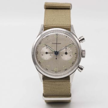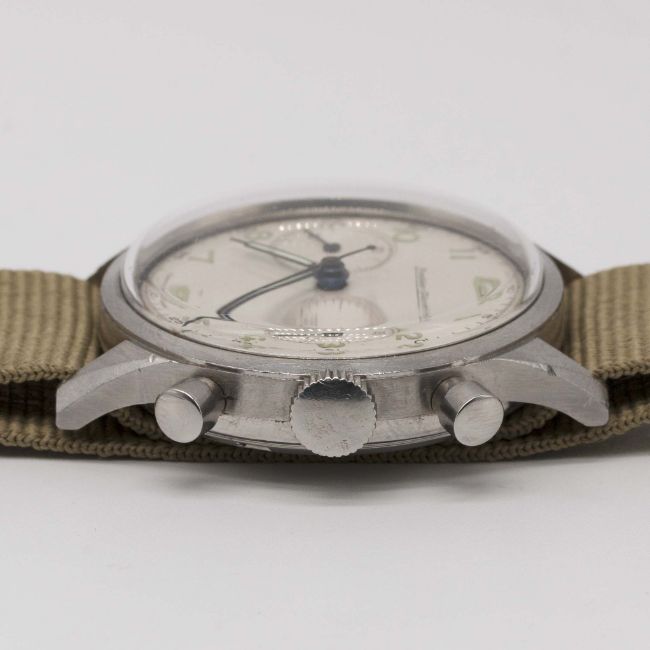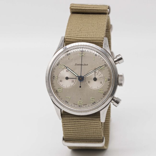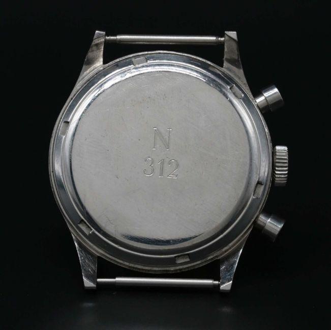 A RARE GENTLEMAN'S LARGE SIZE STAINLESS STEEL DANISH MILITARY ROYAL NAVY SOVAERNET EXCELSIOR PARK "WATERPROOF" CHRONOGRAPH WRIST WATCHCIRCA 1960sMovement: Manual wind, Excelsior Park cal. 4-68.Case: Diameter approx. 37mm, bevelled screw back, issue markings N 312, numbered 95x,xxx.Strap: Leather.CONDITION REPORTDial: Original dial in good condition, showing small signs of age, light indentation to right of continuous seconds register.Movement: Working at present.Case: In very good condition, with small scratches due to use.Strap/Bracelet: In excellent condition.