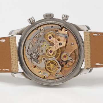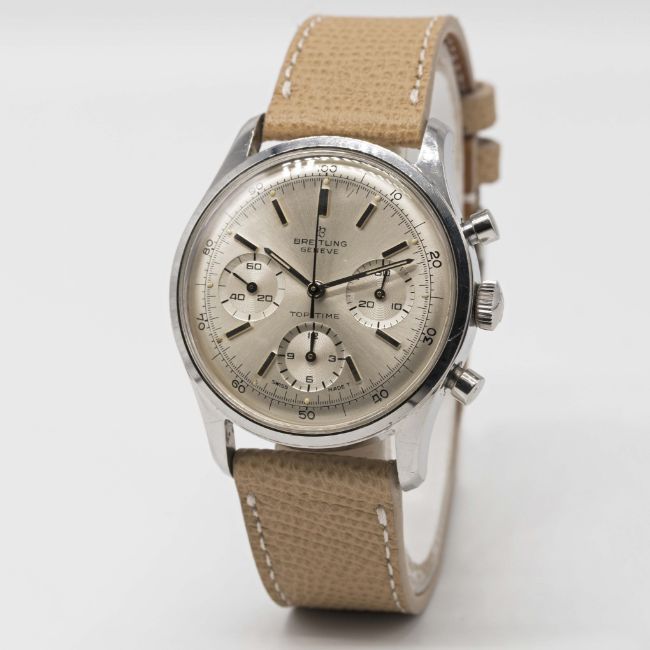 A RARE GENTLEMAN'S STAINLESS STEEL BREITLING TOP TIME CHRONOGRAPH WRIST WATCHCIRCA 1966, REF. 810 "MK1.2", WITH SILVER "ALBINO" DECIMAL DIALMovement: 17J, manual wind, Venus cal. 178, signed Breitling Watch Ltd.Case: Diameter approx. 38mm, snap back, signed Breitling, numbered 1,0xx,xxx, Breitling crown.Strap: Leather.CONDITION REPORTDial: Original dial in very good condition, showing some small signs of age.Movement: Working at present.Case: In excellent condition, with some light scratches due to general use.Strap/Bracelet: In excellent condition.