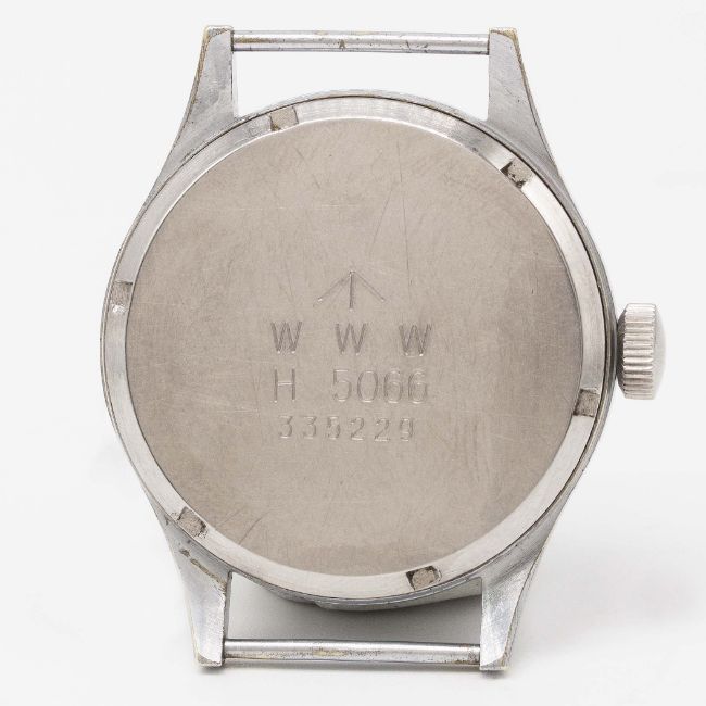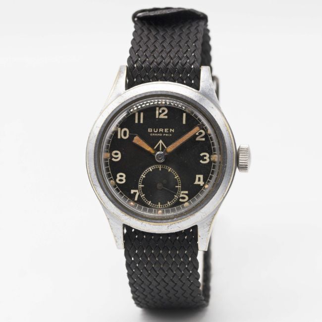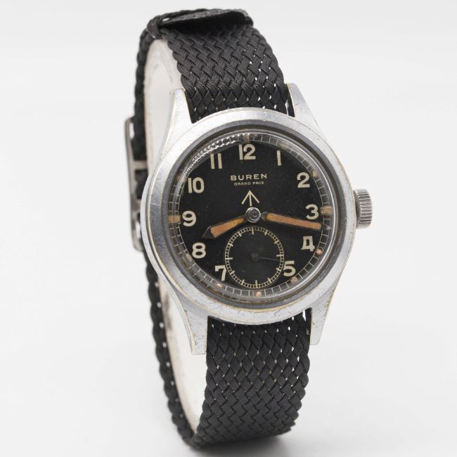 A GENTLEMAN'S BRITISH MILITARY BUREN GRAND PRIX W.W.W. WRIST WATCHCIRCA 1940s, PART OF THE "DIRTY DOZEN"Movement: 15J, manual wind, signed Buren Grand Prix.Case: Diameter approx. 36.5mm, fixed bars, nickel plated case with steel screw back, issue markings ^ W.W.W. H 5066 335229, dust cover.Strap: Perlon.CONDITION REPORTDial: Original dial in excellent condition.Movement: Working at present.Case: In very good condition, with some light scratches & wear due to use.Strap/Bracelet: In excellent condition.