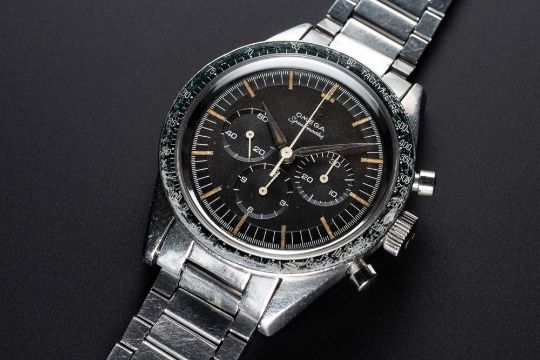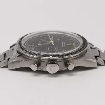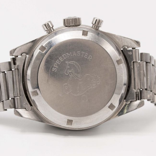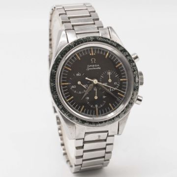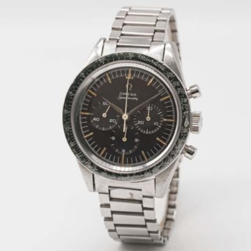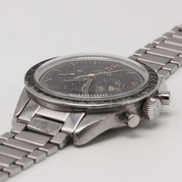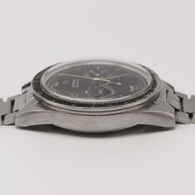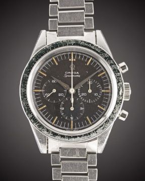 A VERY RARE GENTLEMAN'S STAINLESS STEEL OMEGA SPEEDMASTER CHRONOGRAPH BRACELET WATCHCIRCA 1962, REF. 2998-5 WITH "ALPHA" HANDS & DARK BROWN "CHOCOLATE" DIALMovement: 17J, manual wind, cal. 321, signed Omega Watch Co., numbered 18,xxx,xxx.Case: Diameter approx. 40mm, screw back, signed Omega Watch Co, Speedmaster emblem on case back, dust cover, "DON" tachymetre bezel faded to green, Omega crown.Bracelet: Original Omega flat link bracelet, end links numbered 6, clasp dated 2.61.CONDITION REPORTDial: Original dial in excellent condition.Movement: Working at present.Case: In good condition, with small scratches due to general use, bezel showing some wear.Strap/Bracelet: In good condition, with light scratches & wear due to general use.