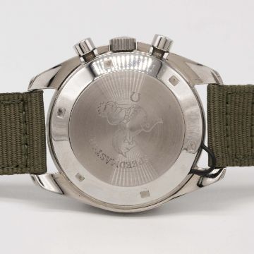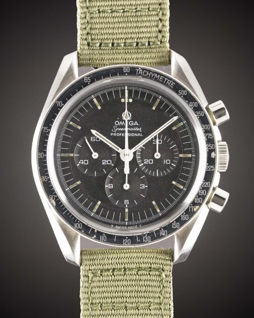 A RARE GENTLEMAN'S STAINLESS STEEL OMEGA SPEEDMASTER PROFESSIONAL CHRONOGRAPH WRIST WATCHCIRCA 1970, REF. 145.022-69 ST WITH "220 MISPRINT" BEZELMovement: 17J, manual wind, cal. 861, signed Omega, numbered 31,xxx,xxx.Case: Diameter approx. 42mm, screw back, Speedmaster emblem on case back, signed Omega Watch Co, dust cover, "220 misprint" tachymetre bezel faded to blue, Omega crown.Strap: Textile.CONDITION REPORTDial: Original dial in excellent condition, showing small signs of age & strong patina to luminous.Movement: Working at present.Case: In very good condition, with some light scratches due to general use.Strap/Bracelet: In excellent condition.