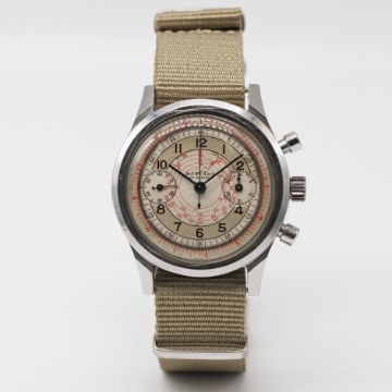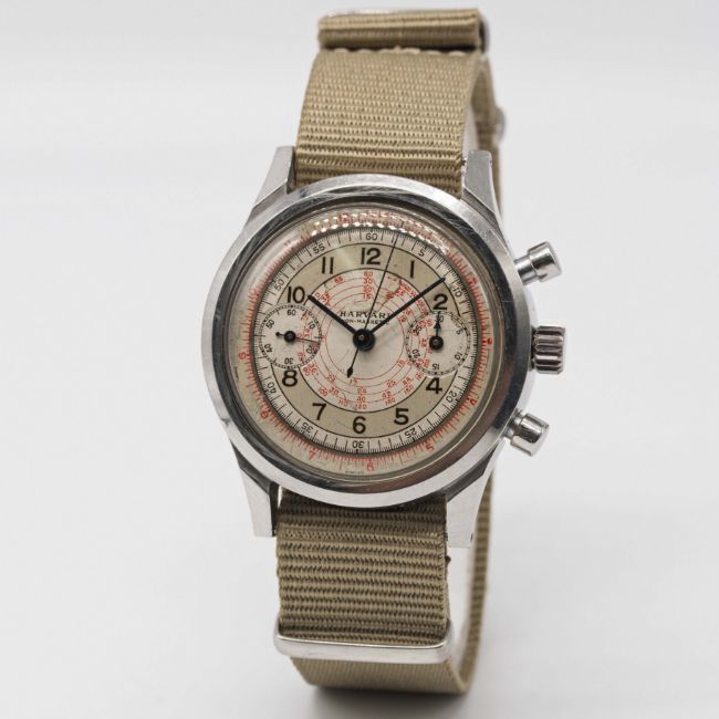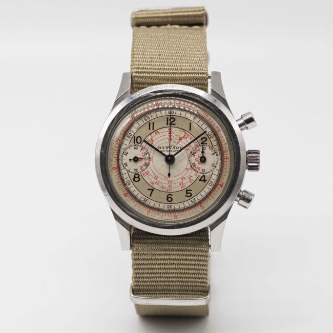 A GENTLEMAN'S STAINLESS STEEL HARVARD "CLAMSHELL" CHRONOGRAPH WRIST WATCHCIRCA 1940s, WITH TWO TONE SILVER MULTI-SCALE DIALMovement: 17J, manual wind, Venus cal. 165. Case: Diameter approx. 36mm, "clamshell" case with four screws, numbered, "faceted" lugs.Strap: Leather.CONDITION REPORTDial: Original dial in good condition, showing signs of age.Movement: Working at present.Case: In very good condition, with some light scratches due to general use.Strap/Bracelet: In excellent condition.