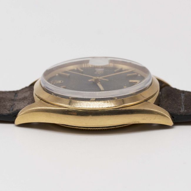 A RARE GENTLEMAN'S 18K SOLID GOLD ROLEX OYSTER PERPETUAL DATEJUST WRIST WATCHCIRCA 1969, REF. 1600 GREY SUNBURST DIAL WITH GILT FONT & TRACKINGMovement: 26J, automatic chronometer, cal. 1570, signed Montres Rolex S.A., numbered.Case: Diameter approx. 36mm, Oyster case, signed Montres Rolex S.A., numbered 2,0xx,xxx, 18k hallmarks, smooth bezel, Rolex crown.Strap: Suede.CONDITION REPORTDial: Original dial in excellent condition.Movement: Working at present.Case: In excellent condition, with some scratches due to general use.Strap/Bracelet: In excellent condition.