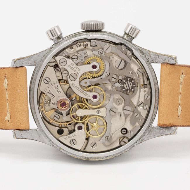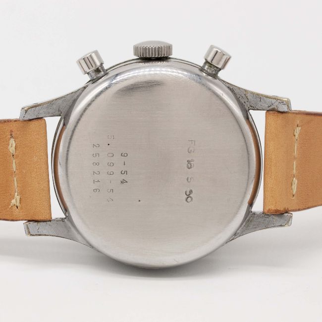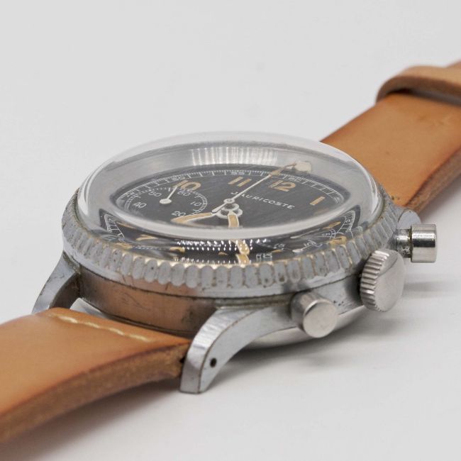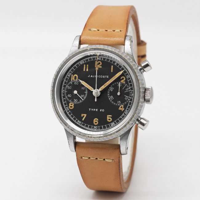 A GENTLEMAN'S FRENCH MILITARY AIR FORCE J. AURICOSTE TYPE 20 FLYBACK CHRONOGRAPH WRIST WATCHCIRCA 1950s, REF. 5.099-54Movement: 17J, manual wind, signed J. Auricoste Type 20, Lemania cal. 2040.Case: Diameter approx. 38mm, plated base metal case, steel snap back with French military service markings, maker's mark HF, rotating milled bezel with inner pointer.Strap: Leather.CONDITION REPORTDial: Original dial in very good condition.Movement: Working at present.Case: In good condition, with some small scratches & wear to plating due to use.Strap/Bracelet: In excellent condition.