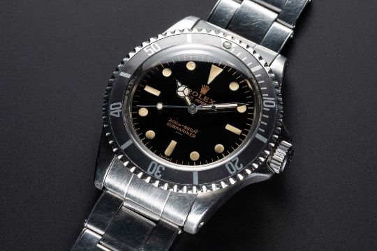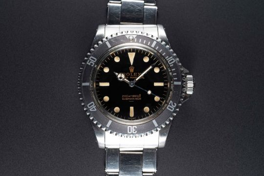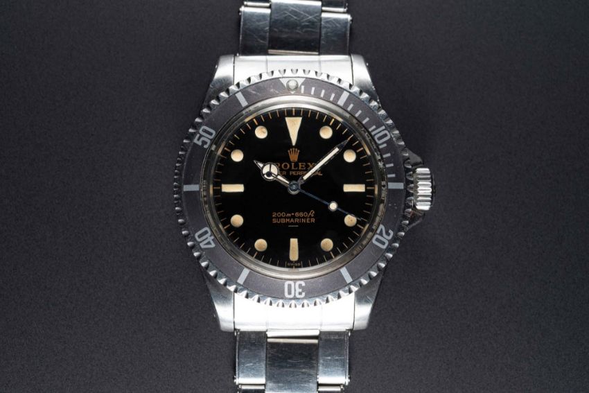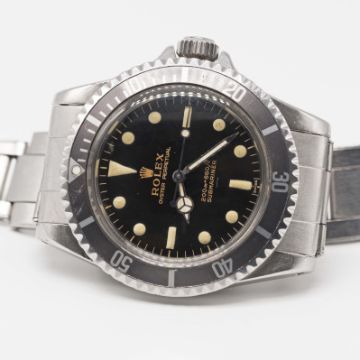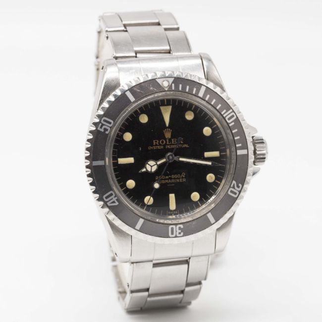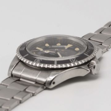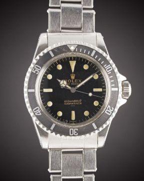 A VERY RARE GENTLEMAN'S STAINLESS STEEL ROLEX OYSTER PERPETUAL SUBMARINER BRACELET WATCHCIRCA 1964, REF. 5513 PCG WITH GLOSS BLACK GILT "UNDERLINE" DIALMovement: 26J, automatic, cal. 1530, signed Rolex Geneva.Case: Diameter approx. 40mm, Oyster case with pointed crown guards, signed Montres Rolex S.A., dated III.63, numbered 1,0xx,xxx, "long 5" "fat font" 60 minute rotating bezel faded to grey, Rolex crown.Bracelet: Original Rolex Oyster riveted bracelet, numbered 7206/80, dated 2.65. CONDITION REPORTDial: Original dial in excellent condition, showing some small signs of age.Movement: Working at present.Case: In very good condition, with some small scratches & light wear due to general use.Strap/Bracelet: In good condition, with light scratches & wear due to general use, some links showing signs of repair on inside.