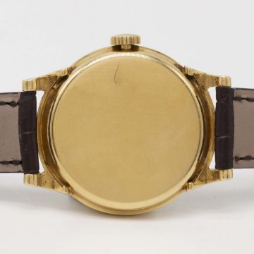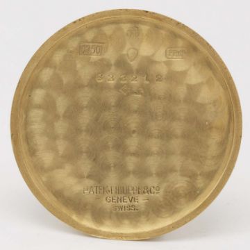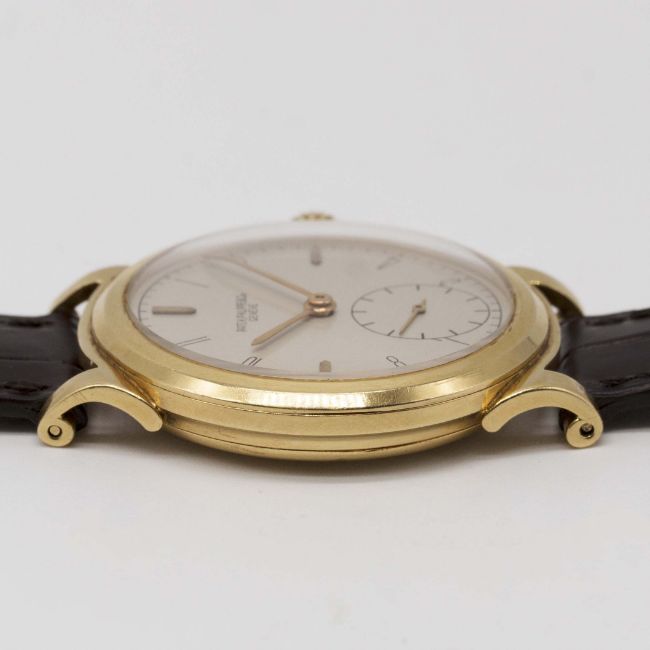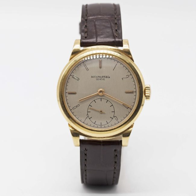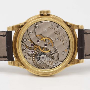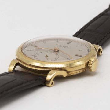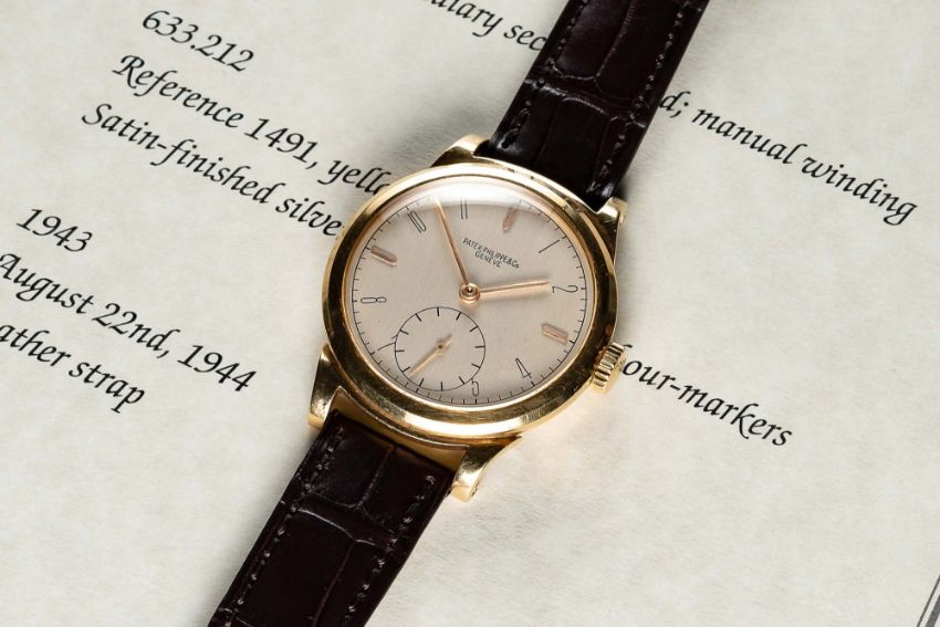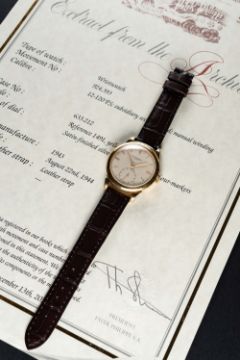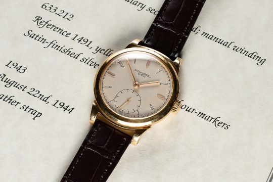 A RARE GENTLEMAN'S 18K SOLID GOLD PATEK PHILIPPE WRIST WATCHDATED 1943, REF. 1491 WITH "SCROLL LUGS", ACCOMPANIED BY PATEK PHILIPPE EXTRACT FROM THE ARCHIVESMovement: Manual wind, cal. 12-120 PS, signed Patek Philippe & Co., numbered 92x,xxx.Case: Diameter approx. 34mm, snap back, signed Patek Philippe & Co, 18k hallmarks, numbered 63x,xxx.Strap: Patek Philippe leather strap with unsigned pin buckle.CONDITION REPORTDial: Original dial in excellent condition.Movement: Working at present.Case: In very good condition, with some light scratches due to general use, some light dents to case back.Strap/Bracelet: In excellent condition.