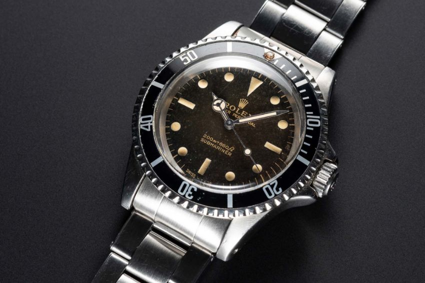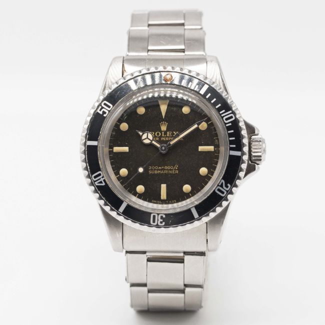 A RARE GENTLEMAN'S STAINLESS STEEL ROLEX OYSTER PERPETUAL SUBMARINER BRACELET WATCHCIRCA 1966, REF. 5513 WITH "TROPICAL" GLOSS BLACK GILT DIALMovement: 26J, automatic, cal. 1520, signed Montres Rolex S.A.Case: Diameter approx. 40mm, Oyster case, signed Montres Rolex S.A., dated III.66, numbered 1,4xx,xxx, "long 5" "fat font" 60 minute rotating bezel, Rolex crown.Bracelet: Original Rolex Oyster riveted bracelet, numbered 7206/80, dated 3.65.CONDITION REPORTDial: Original dial in excellent "tropical" condition, showing small signs of age & a brown dial patina.Movement: Working at present.Case: In very good condition.Strap/Bracelet: In good condition, with light scratches & wear due to general use.