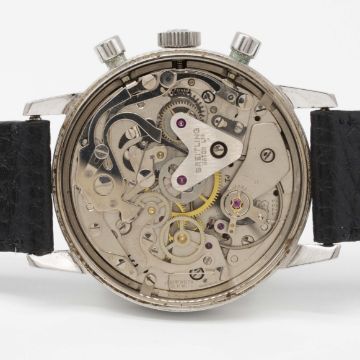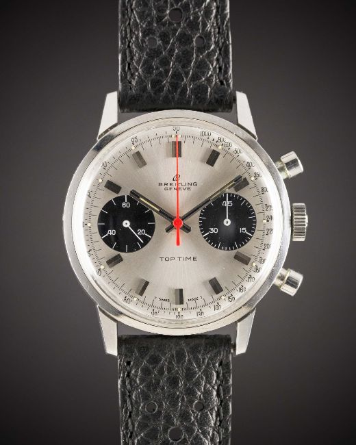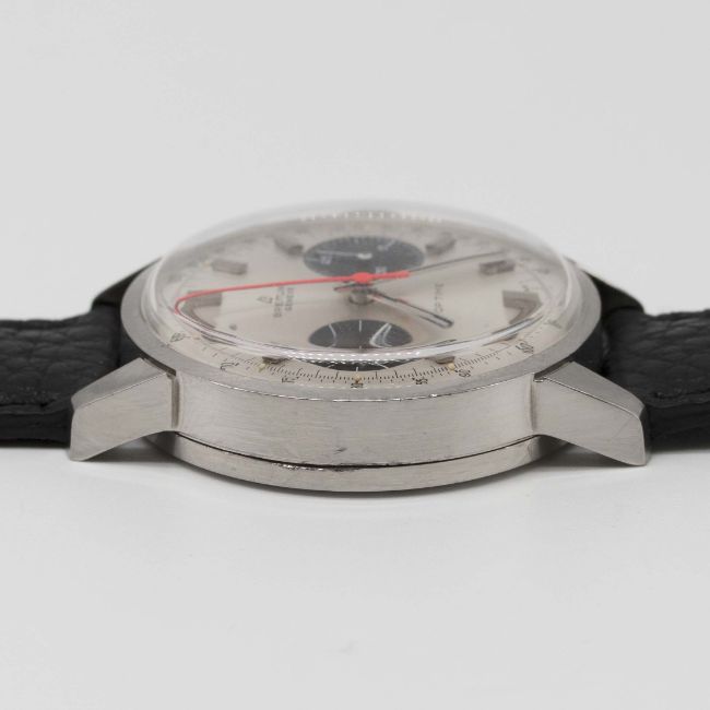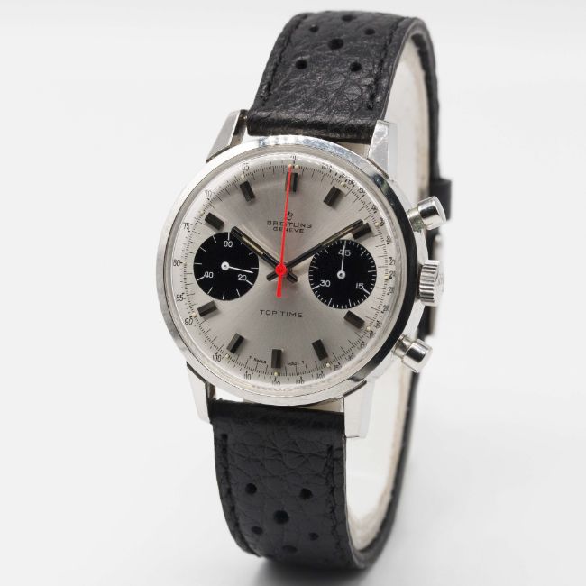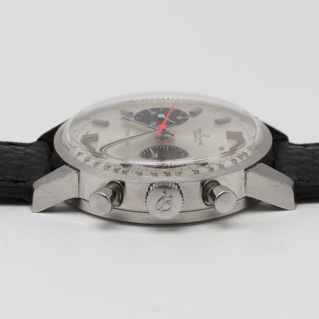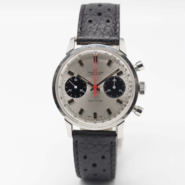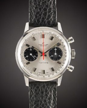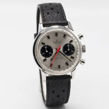 A GENTLEMAN'S STAINLESS STEEL BREITLING TOP TIME CHRONOGRAPH WRIST WATCHCIRCA 1969, REF. 2002-33 WITH "PANDA" DIALMovement: 17J, manual wind, Valjoux cal. 7733, signed Breitling Watch Ltd.Case: Diameter approx. 36mm, snap back, signed Breitling, numbered 1,2xx,xxx, Breitling crown.Strap: Perforated leather.CONDITION REPORTDial: Original dial in excellent condition.Movement: Working at present.Case: In excellent condition, with some light scratches due to general use.Strap/Bracelet: In excellent condition.