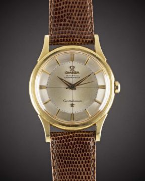 A GENTLEMAN'S 18K SOLID YELLOW GOLD OMEGA CONSTELLATION CHRONOMETER WRIST WATCHCIRCA 1960, REF. 14381/2 SC-12 WITH SILVER "PIE PAN" DIALMovement: 24J, automatic chronometer, cal. 551, signed Omega Watch Co., numbered 17,xxx,xxx. Case: Diameter approx. 35mm, screw back, Constellation badge embossed on case back, signed Omega Watch Co, 18k hallmarks, Omega crown.Strap: Leather.CONDITION REPORTDial: Original dial in very good condition, showing small signs of age.Movement: Working at present.Case: In excellent condition, with small scratches due to general use.Strap/Bracelet: In excellent condition.