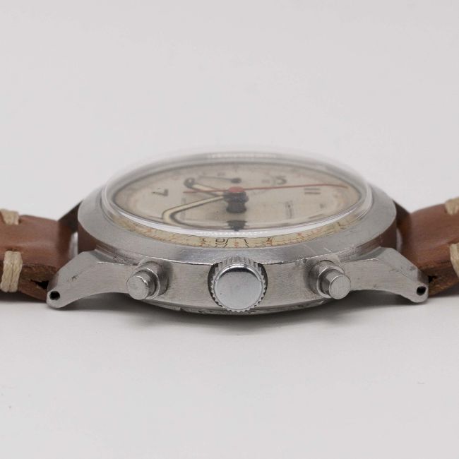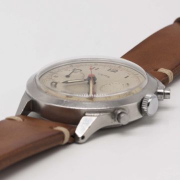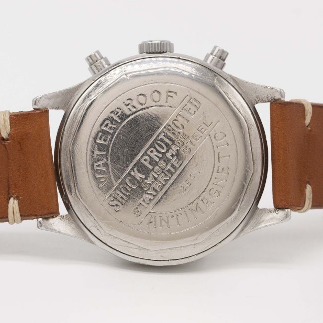 A RARE GENTLEMAN'S LARGE SIZE STAINLESS STEEL VETTA ANTIMAGNETIC WATERPROOF CHRONOGRAPH WRIST WATCHCIRCA 1940s, REF. 2501 WITH SPILLMAN CASEMovement: 17J, manual wind, Valjoux cal. 22. Case: Diameter approx. 38mm, screw back, faceted lugs, "inverted" pushers.Strap: Leather.CONDITION REPORTDial: Original dial in good condition, showing signs of age & patina.Movement: Working at present.Case: In very good condition, with small scratches due to general use.Strap/Bracelet: In excellent condition.