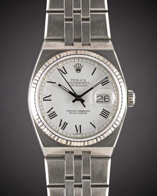A GENTLEMAN'S STEEL & WHITE GOLD ROLEX OYSTERQUARTZ DATEJUST BRACELET WATCHCIRCA 1984, REF. 17014 WITH WHITE BUCKLEY DIALMovement: 11J, quartz chronometer, quick-set date, cal. 5035, signed Rolex, numbered.Case: Diameter approx. 36mm, Oyster case, signed Montres Rolex S.A., numbered 8,5xx,xxx, solid white gold fluted bezel, sapphire crystal, Rolex crown.Bracelet: Original Rolex Oyster bracelet, numbered J10/17010 B.CONDITION REPORTDial: Original dial in excellent condition.Movement: Working at present.Case: In very good condition, with some small scratches due to general use.Strap/Bracelet: In excellent condition, with some light scratches due to general use.