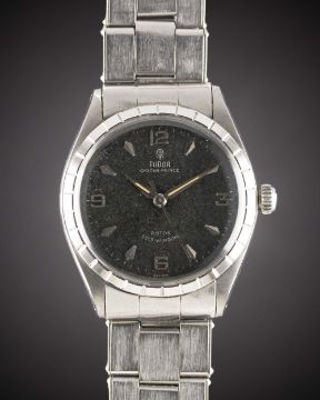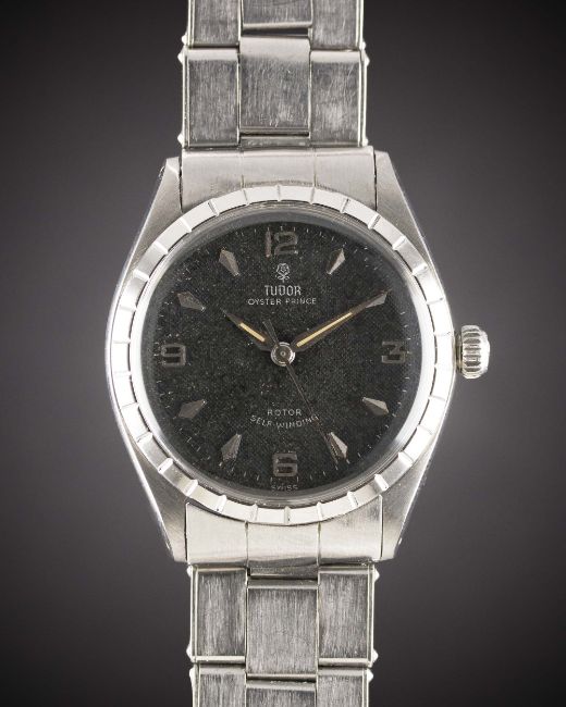 A GENTLEMAN'S STAINLESS STEEL ROLEX TUDOR OYSTER PRINCE BRACELET WATCHCIRCA 1961, REF. 7965 WITH BLACK "HONEYCOMB" DIAL & "DAGGER" HANDSMovement: 25J, automatic, signed Tudor Auto-Prince.Case: Diameter approx. 35mm, Oyster case, signed Montres Tudor S.A., dated I.61, numbered 32x,xxx, faceted bezel, Rolex crown.Bracelet: Rolex Oyster expanding riveted bracelet, numbered 6635, end links numbered 57 & 61, dated 4.67.CONDITION REPORTDial: Original dial in good condition, showing some signs of age.Movement: Working at present.Case: In excellent condition.Strap/Bracelet: In very good condition, with light scratches due to general use.