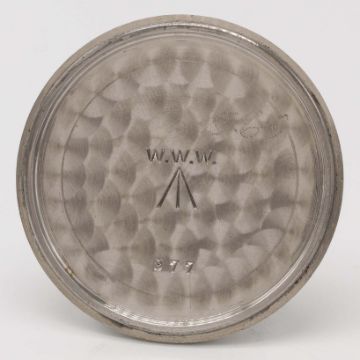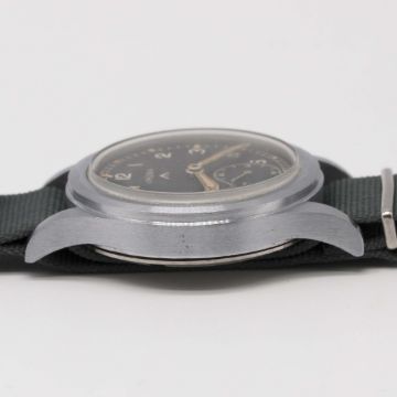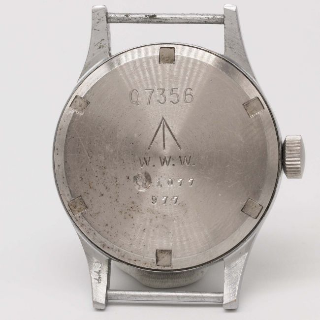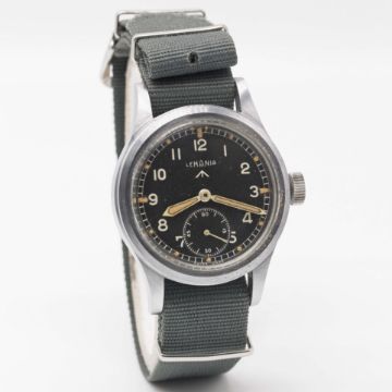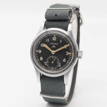 A GENTLEMAN'S BRITISH MILITARY LEMANIA W.W.W. WRIST WATCHCIRCA 1940s, PART OF THE "DIRTY DOZEN"Movement: Manual wind, cal. 27A.Case: Diameter approx. 36mm, fixed bars, nickel plated case with steel screw back, issue markings Q7356 ^ W.W.W. 1077 977, lug numbered 077.Strap: NATO.CONDITION REPORTDial: Original dial in excellent condition, showing small signs of age.Movement: Working at present.Case: In excellent condition, with some light scratches due to use.Strap/Bracelet: In good condition.