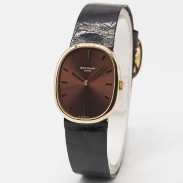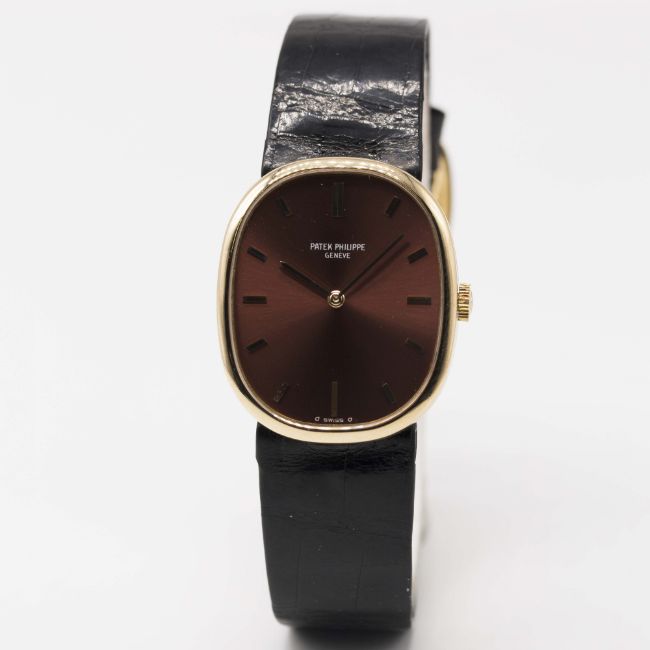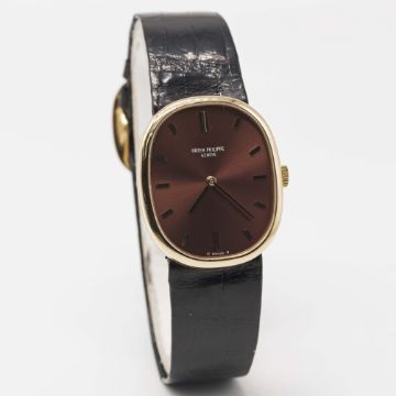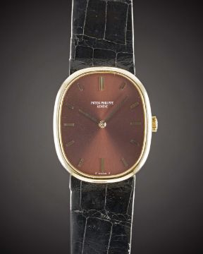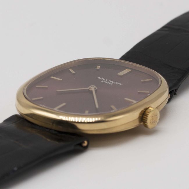 A GENTLEMAN'S 18K SOLID GOLD PATEK PHILIPPE ELLIPSE WRIST WATCHCIRCA 1980s, REF. 3648 WITH BURGUNDY "SIGMA" DIALMovement: 18J, manual wind, cal. 23-300 PM, signed Patek Philippe, numbered 1,2xx,xxx.Case: Approx. 32mm by 27mm, snap back, signed Patek Philippe & Co, 18k hallmarks, numbered 2,7xx,xxx, original crown.Strap: Original Patek Philippe leather strap & 18k solid gold Ellipse pin buckle.CONDITION REPORTDial: Original dial in excellent condition.Movement: Working at present.Case: In excellent condition, with some light scratches due to general use.Strap/Bracelet: In very good condition.