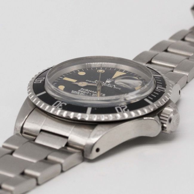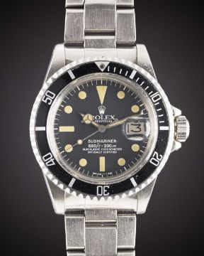 A RARE GENTLEMAN'S STAINLESS STEEL ROLEX OYSTER PERPETUAL DATE SUBMARINER BRACELET WATCHDATED 1980, REF. 1680 WITH MK1 DIAL, ACCOMPANIED BY THE ORIGINAL BOX, GUARANTEE & BOOKLETMovement: 26J, automatic chronometer, cal. 1570, signed Montres Rolex S.A., numbered.Case: Diameter approx. 40mm, Oyster case, signed Montres Rolex S.A., numbered 5,8xx,xxx, 60 minute rotating bezel, Rolex triplock crown.Bracelet: Original Rolex Oyster Submariner bracelet, numbered VD/93150/580.CONDITION REPORTDial: Original dial in excellent condition, showing a nice patina.Movement: Working at present.Case: In excellent condition, with some scratches due to general use.Strap/Bracelet: In very good condition, with light scratches due to general use.