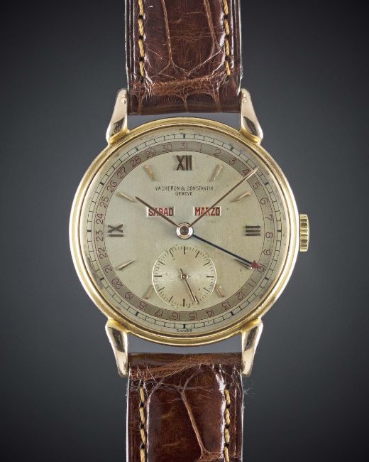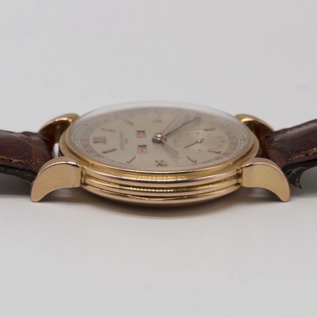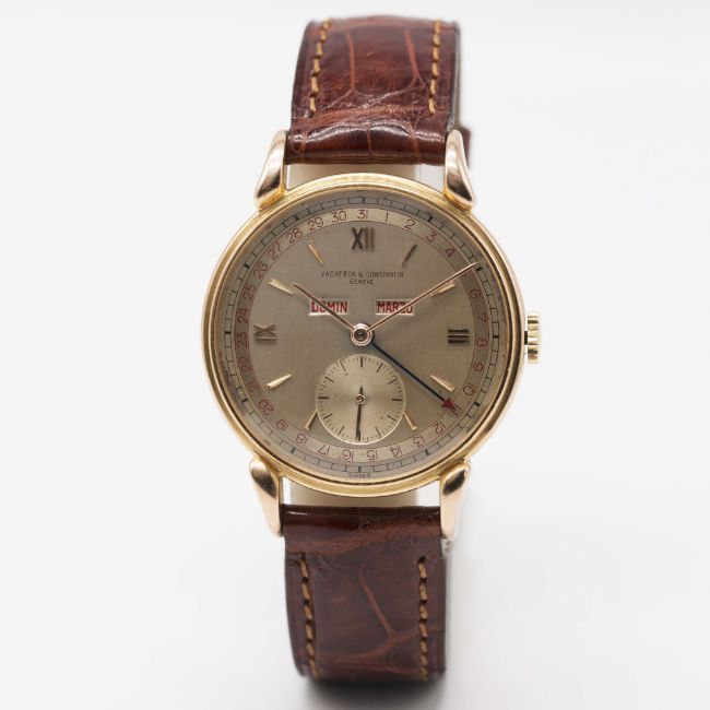 A FINE & RARE GENTLEMAN'S 18K SOLID ROSE GOLD VACHERON & CONSTANTIN TRIPLE CALENDAR WRIST WATCHCIRCA 1940s, WITH TWO TONE ROMAN NUMERAL DIALMovement: 17J, manual wind, cal. V495, signed Vacheron & Constantin, numbered 45x,xxx.Case: Diameter approx. 35mm, "ribbed" case with claw lugs, signed Vacheron & Constantin, 18k hallmarks, numbered 29x,xxx, lug numbered 65 matching last two digits of case number.Strap: Leather.CONDITION REPORTDial: Original dial in excellent condition, showing some signs of age.Movement: Working at present.Case: In excellent condition, with some light scratches due to general use.Strap/Bracelet: In good condition.