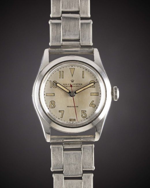 A GENTLEMAN'S STAINLESS STEEL ROLEX OYSTER SPEEDKING PRECISION BRACELET WATCHCIRCA 1940s, REF. 4220 WITH LUMINOUS MARKERS & HANDSMovement: 17J, manual wind 'Patented Superbalance', signed Rolex Precision.Case: Diameter approx. 30mm, Oyster case, signed Rolex S.A., marked R.W.C.Ltd, numbered 33x,xxx, Rolex Oyster Patent crown.Bracelet: Rolex riveted bracelet with straight end-links.CONDITION REPORTDial: Original dial in excellent condition, showing some small signs of age.Movement: Working at present.Case: In very good condition, with some light scratches due to general use.Strap/Bracelet: In very good condition, with some scratches due to general use.
