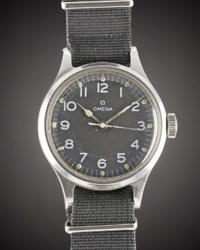 A GENTLEMAN'S STAINLESS STEEL BRITISH MILITARY OMEGA RAF PILOTS WRIST WATCHDATED 1956, WITH BLACK DIALMovement: 16J, manual wind, cal. 30T2SC, signed Omega, numbered 9,7xx,xxx.Case: Diameter approx. 36mm, fixed bars, screw back, issue markings A.M. 6B/159 214/56, inner ring.Strap: NATO.CONDITION REPORTDial: Original dial in very good condition.Movement: Working at present.Case: In excellent condition, with some small scratches due to use.Strap/Bracelet: In excellent condition.